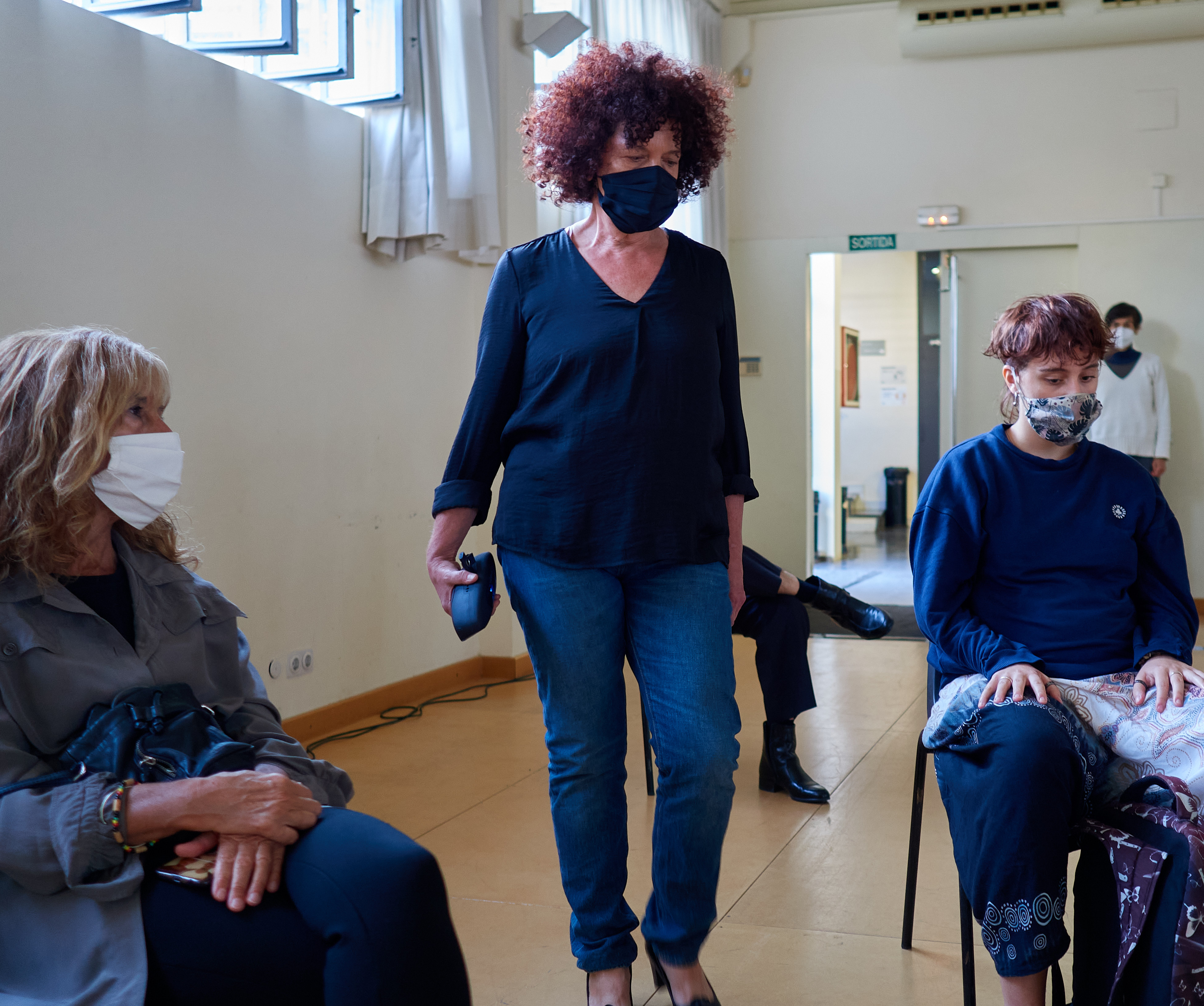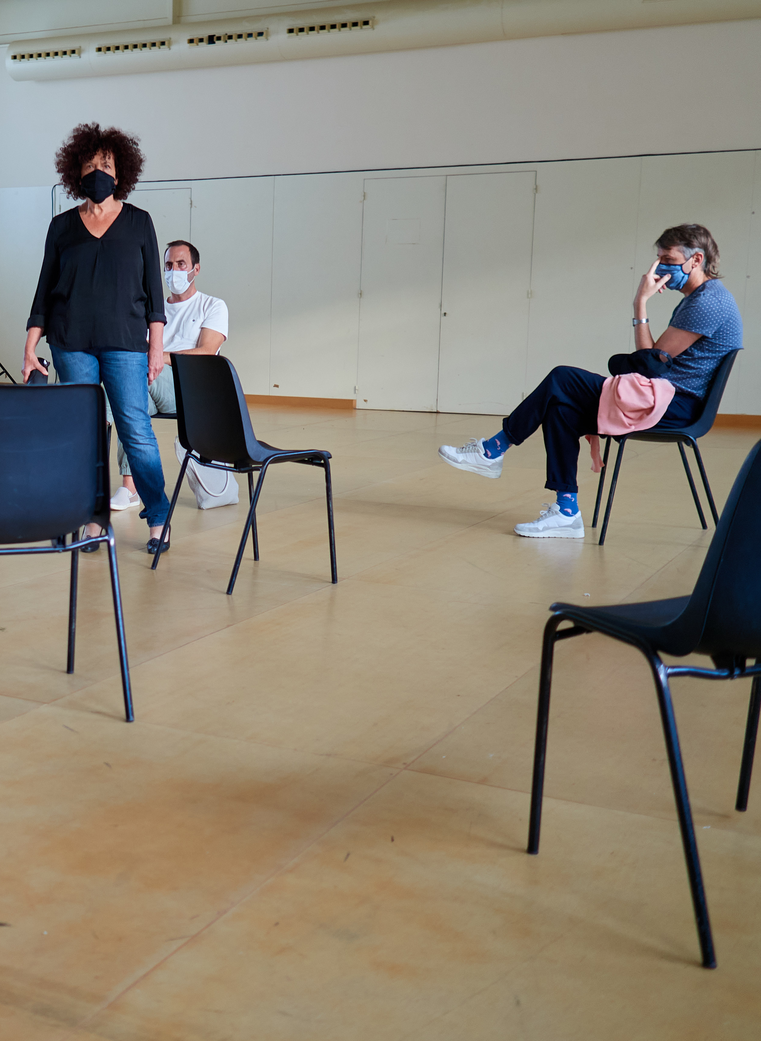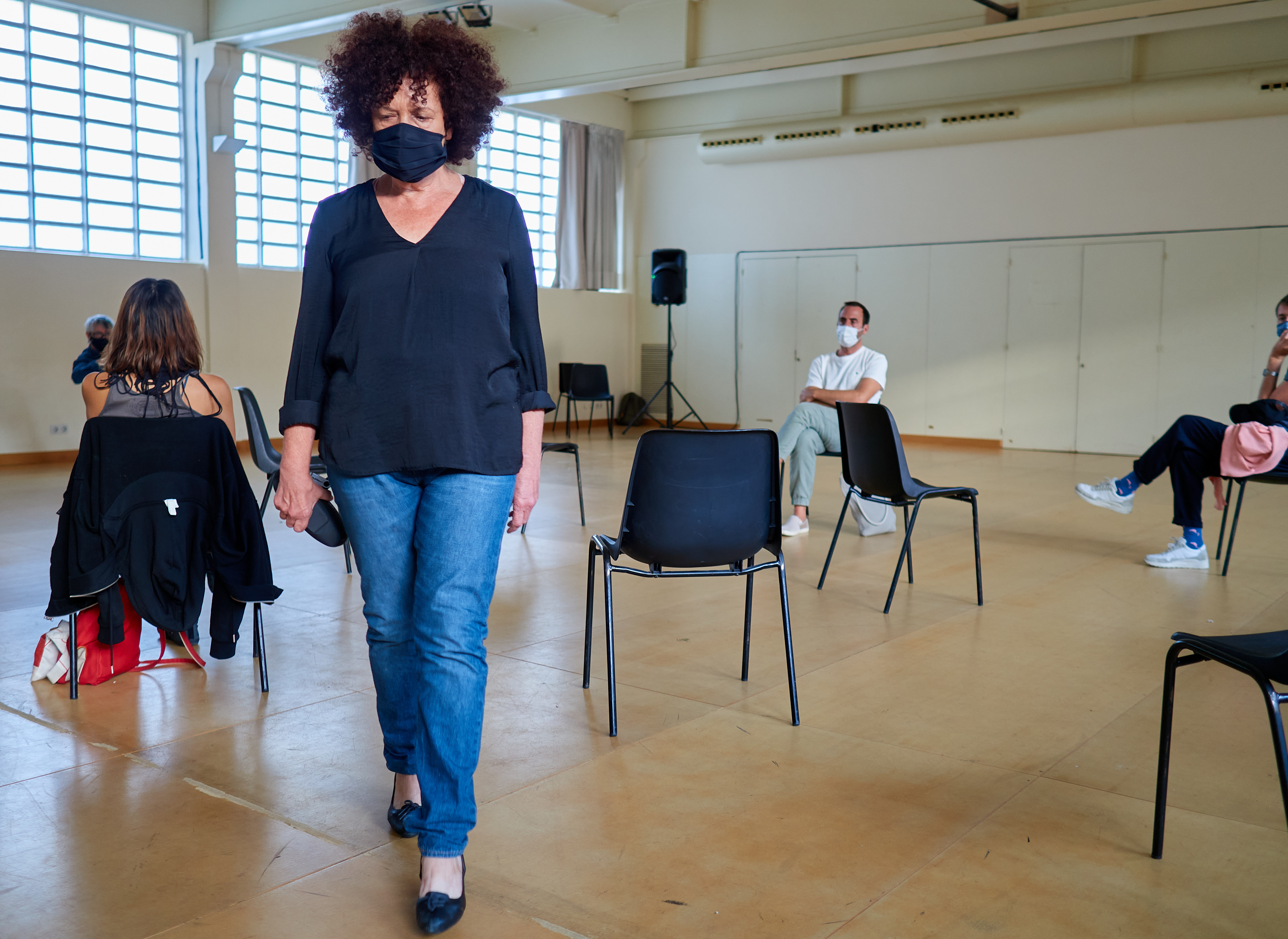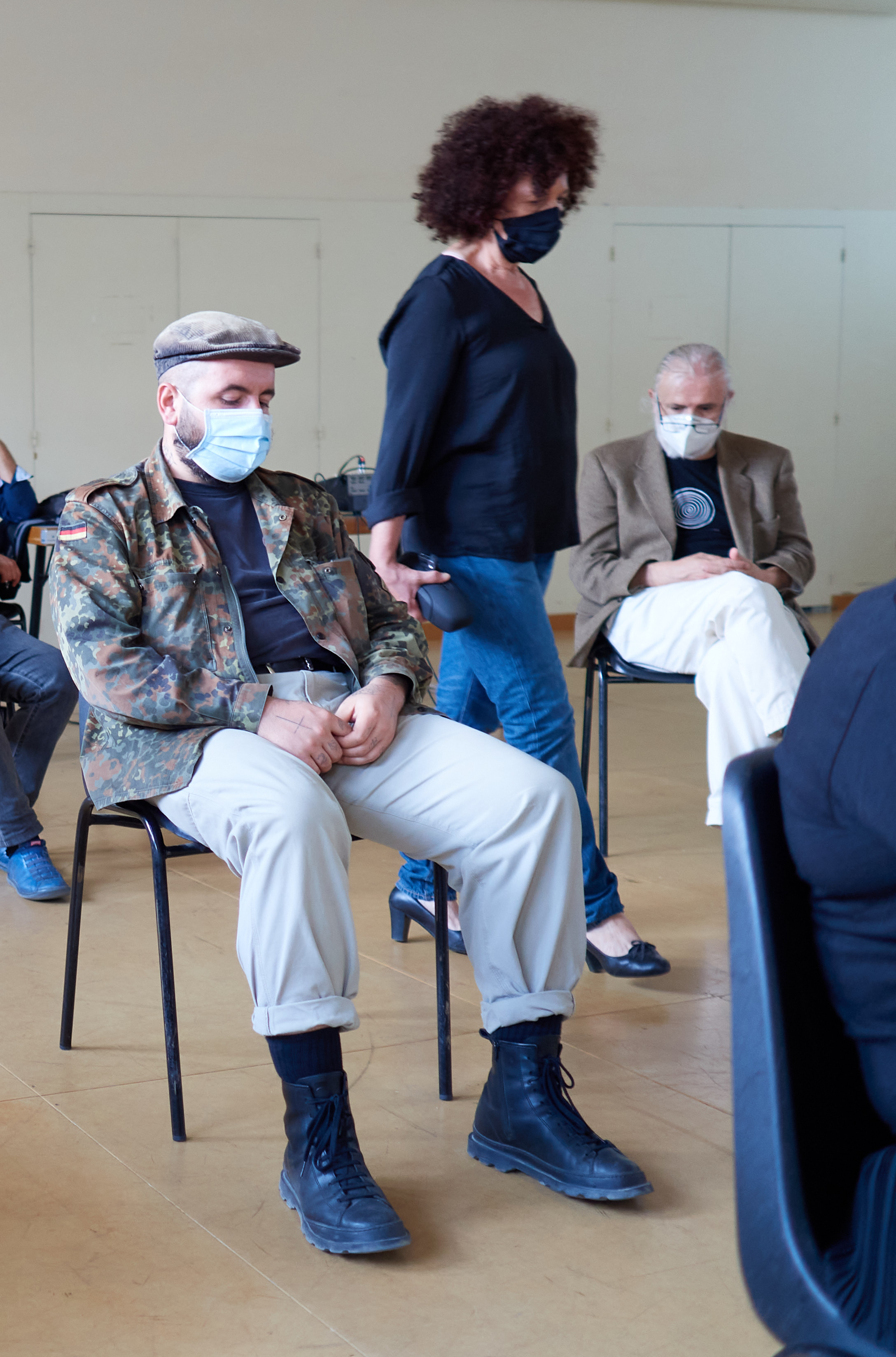 En el espacio se disponen tantas sillas como sea posible sin un punto de vista determinado ni estableciendo un diálogo entre ellas. Cada espectador tiene que sentirse en cierta manera en soledad dentro del espacio.