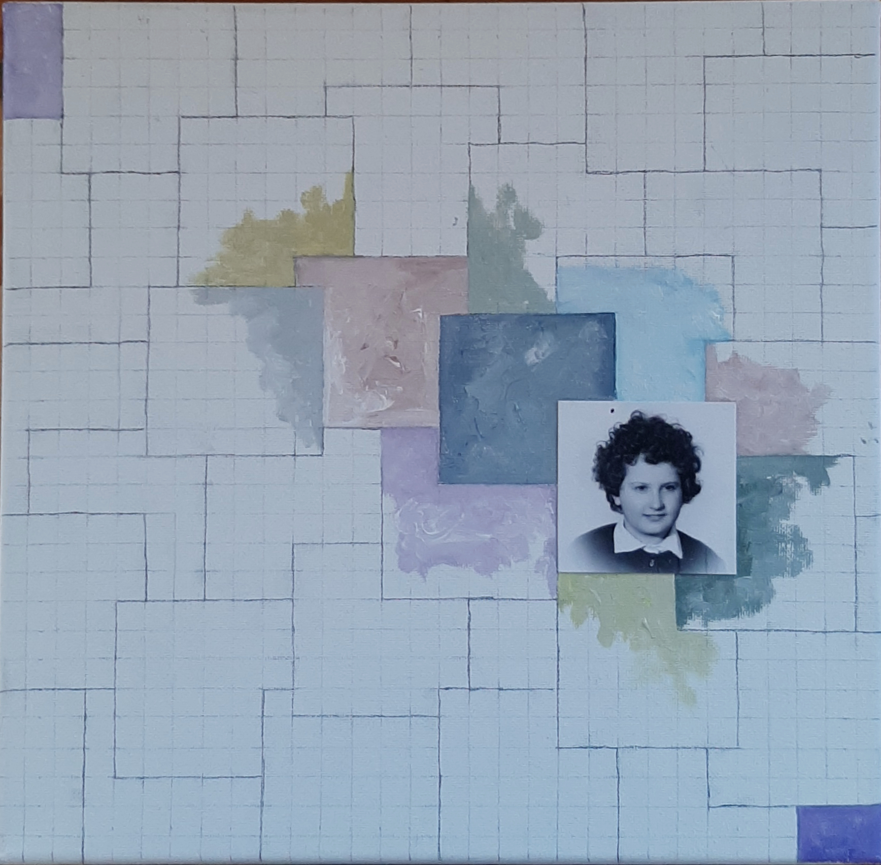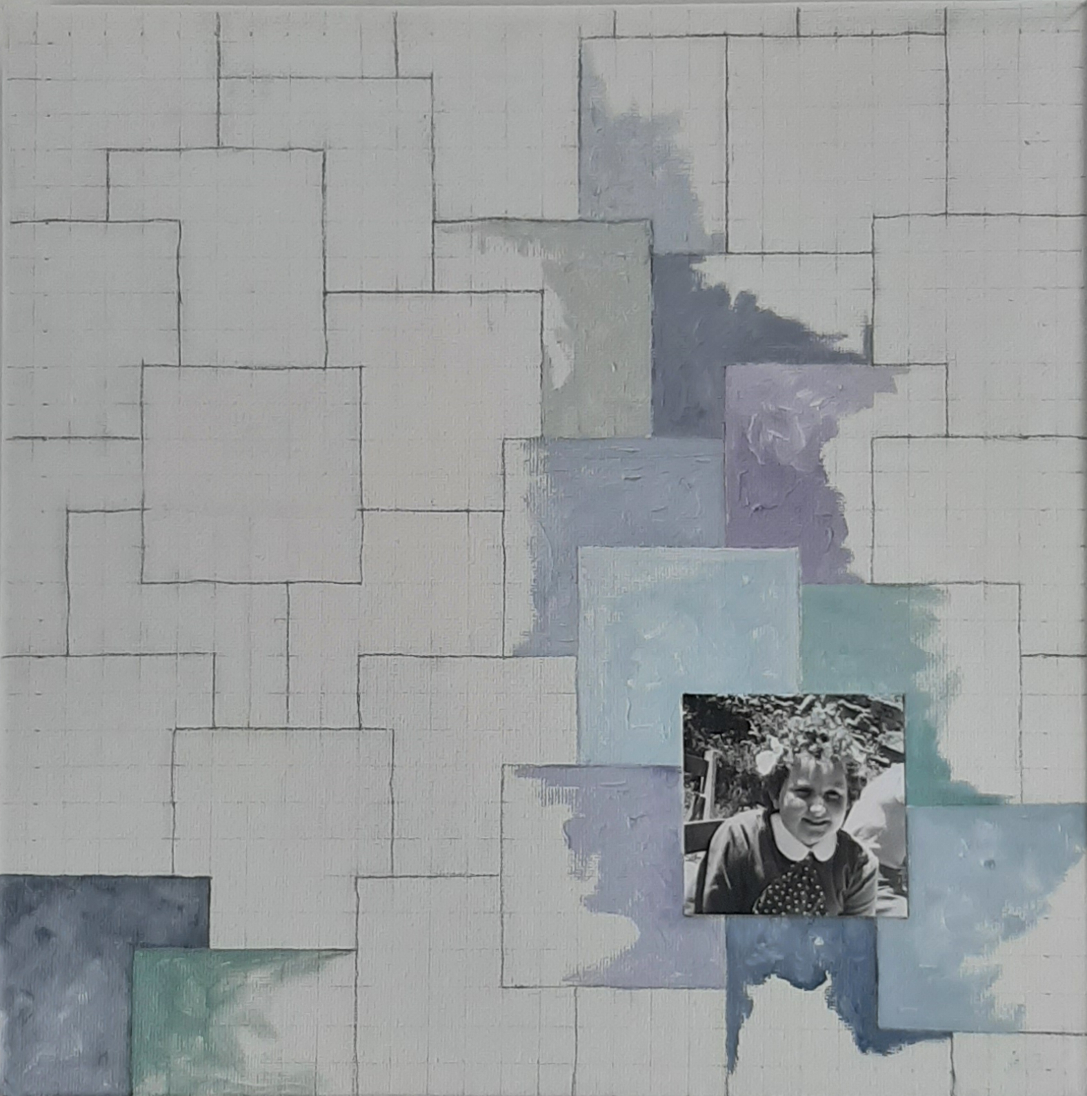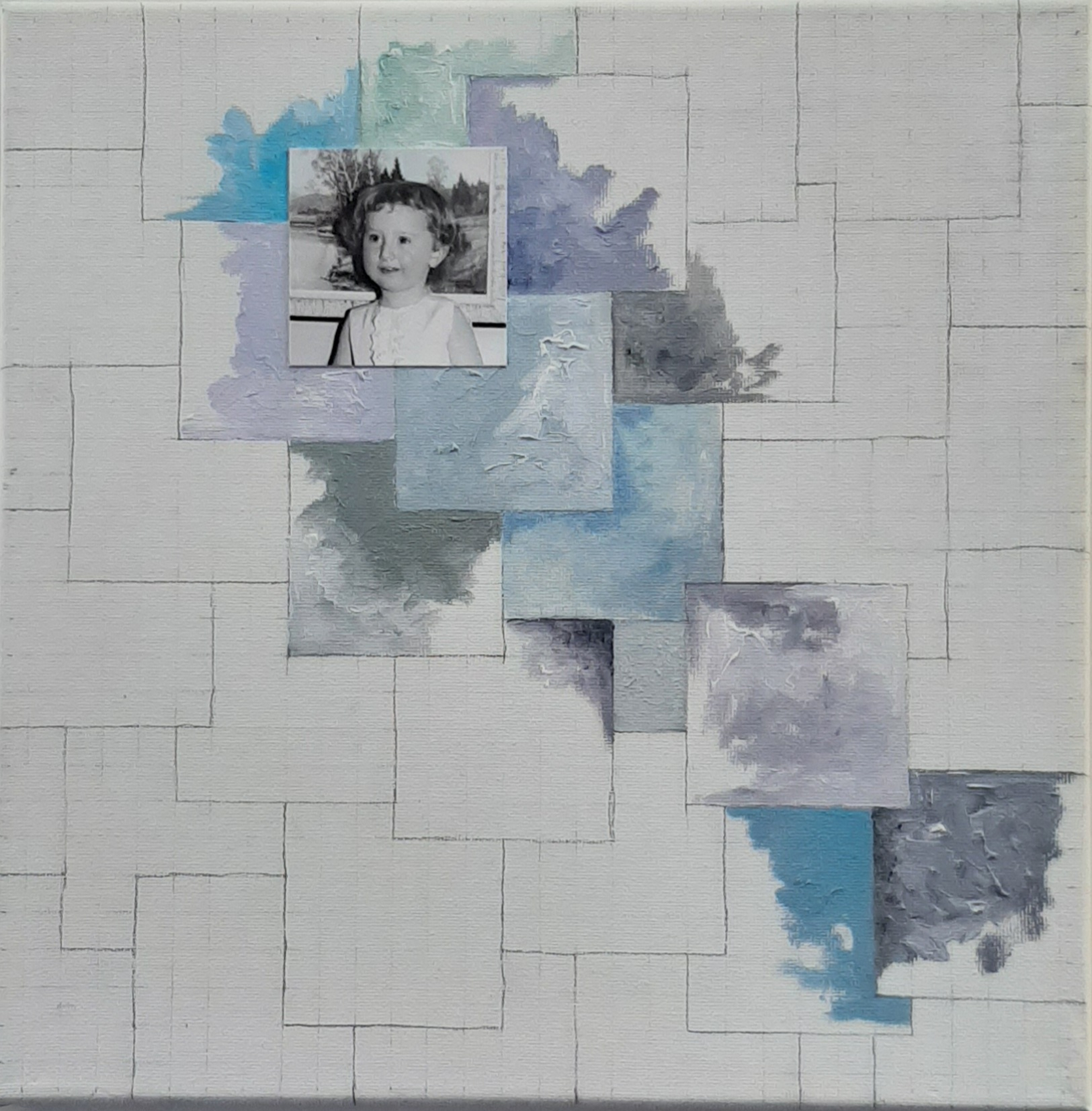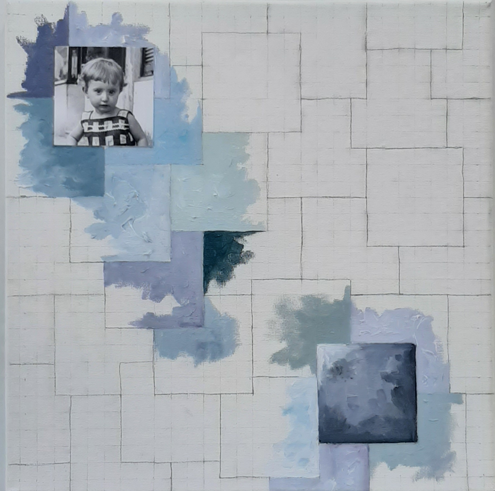 La pieza está compuesta por once lienzos de 30 x 30 cm que componen una única pieza de 150 x 90 cm aproximadamente.  Cada lienzo combina dibujo, pintura al oleo y fotografía, puesto que he incluido en cada uno de ellos una fotografía mía correspondiente al año que “describe”, abarcando un periodo de tiempo entre 1961 y 1971.