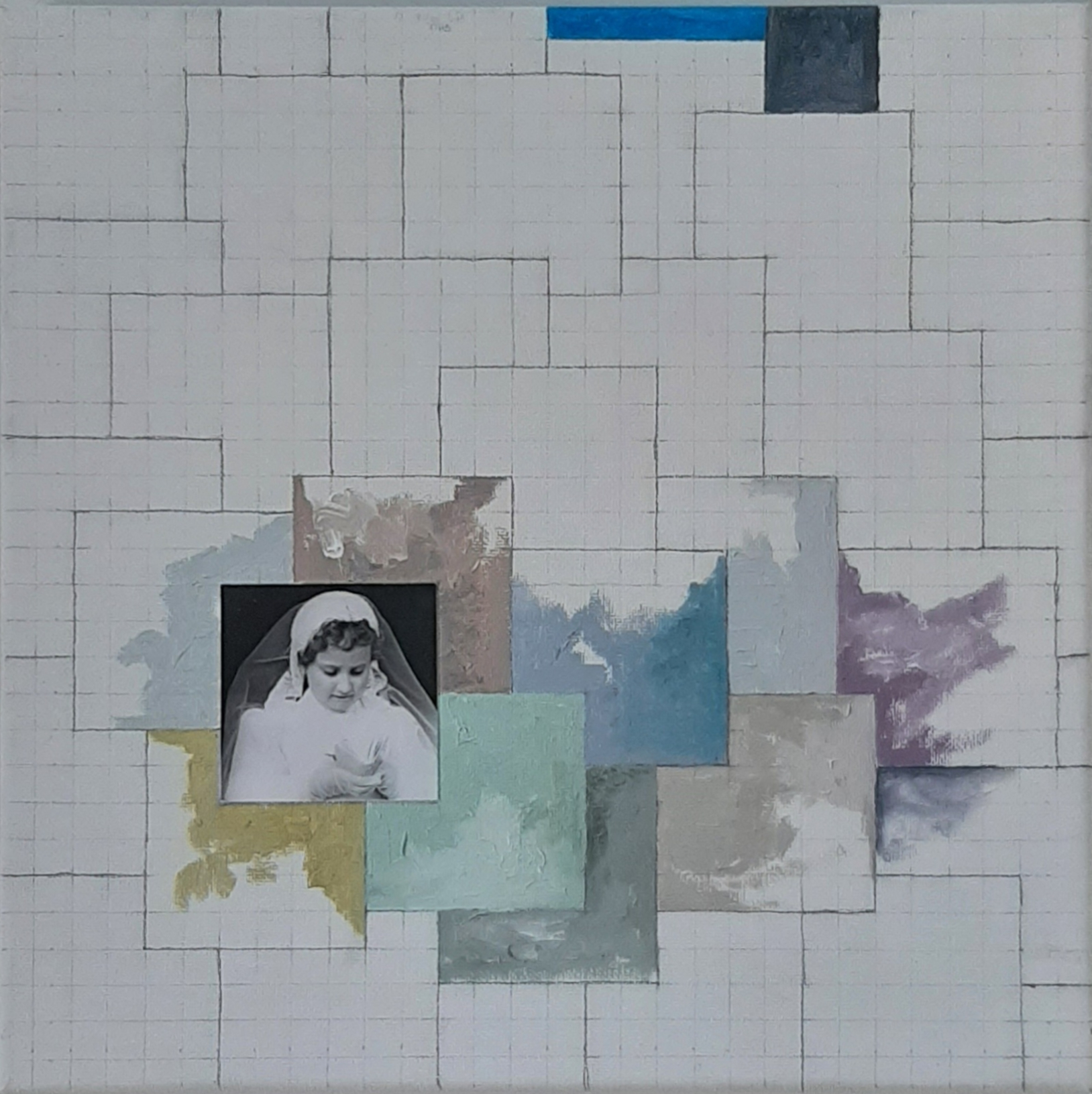 Cada lienzo lleva pegada una fotografía en blanco y negro de 6 x 6 cm impresa en papel Hahnemuhle Photo Matt Fibre 200 gr.