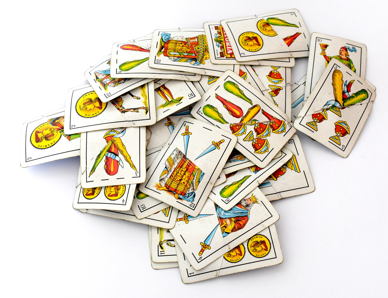 Técnica: Baraja de 40 cartas españolas muy usada, alfileres