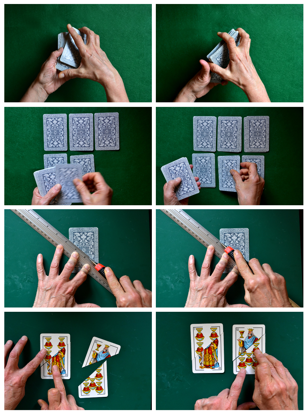 Una baraja completa, puede ser nueva o usada, se barajan las cartas y se separan en montones de a dos aleatoriamente. Cada pareja, siempre sin ver que cartas contiene, se corta con un cúter y se reconstruye cada una de las cartas con la mitad de su pareja utilizando grapas, alfileres o cosiéndola.