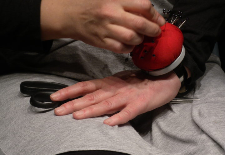 50 alfileres de cabeza negra pinchados en un alfiletero de muñeca.