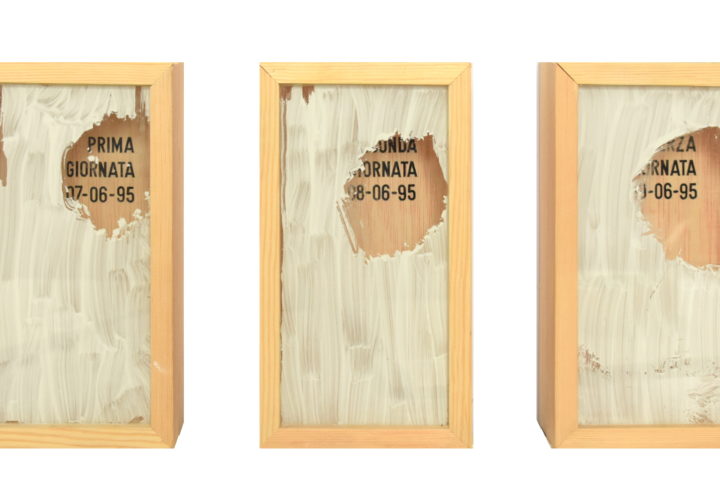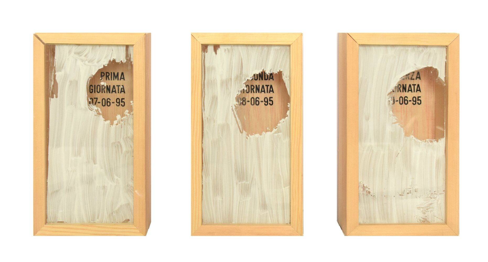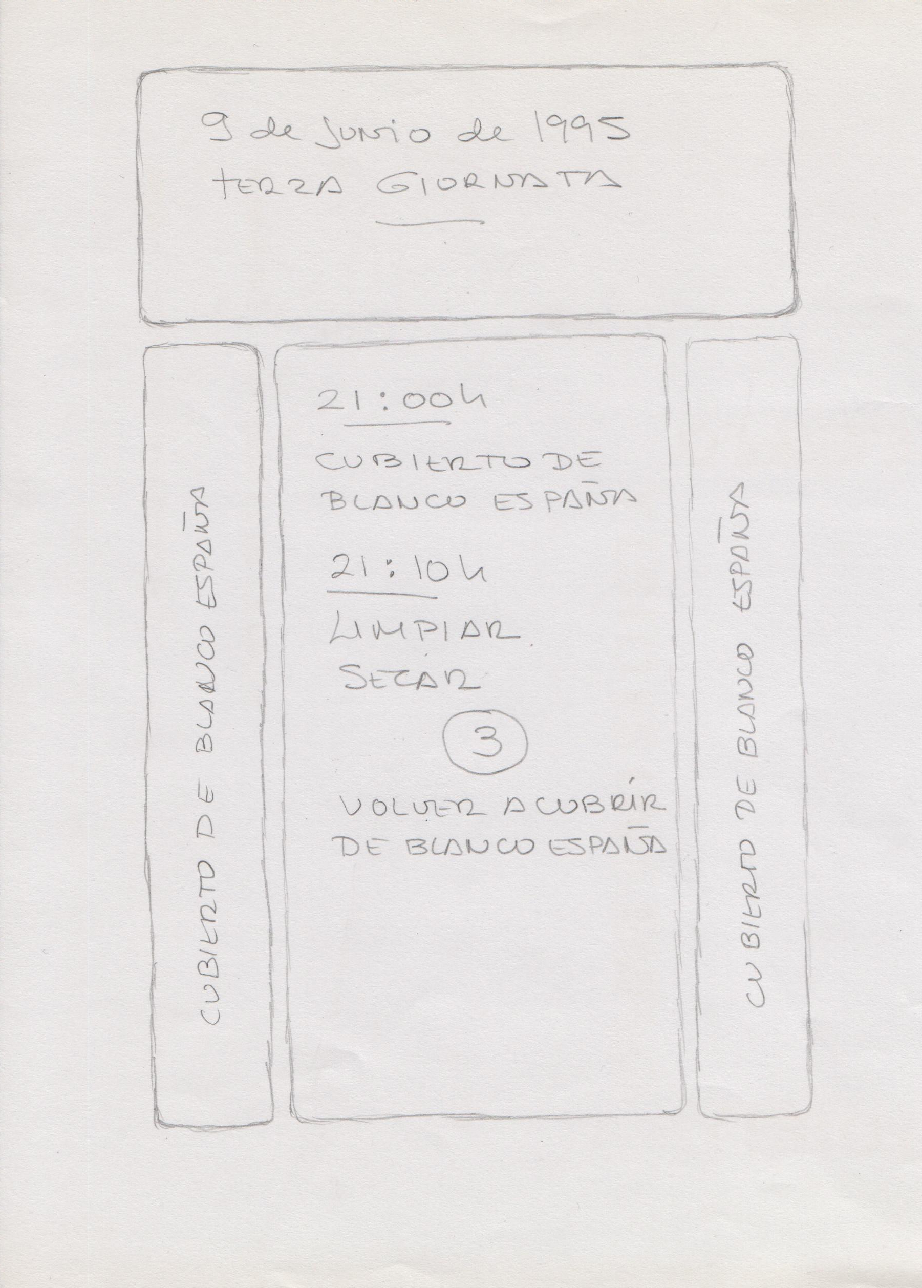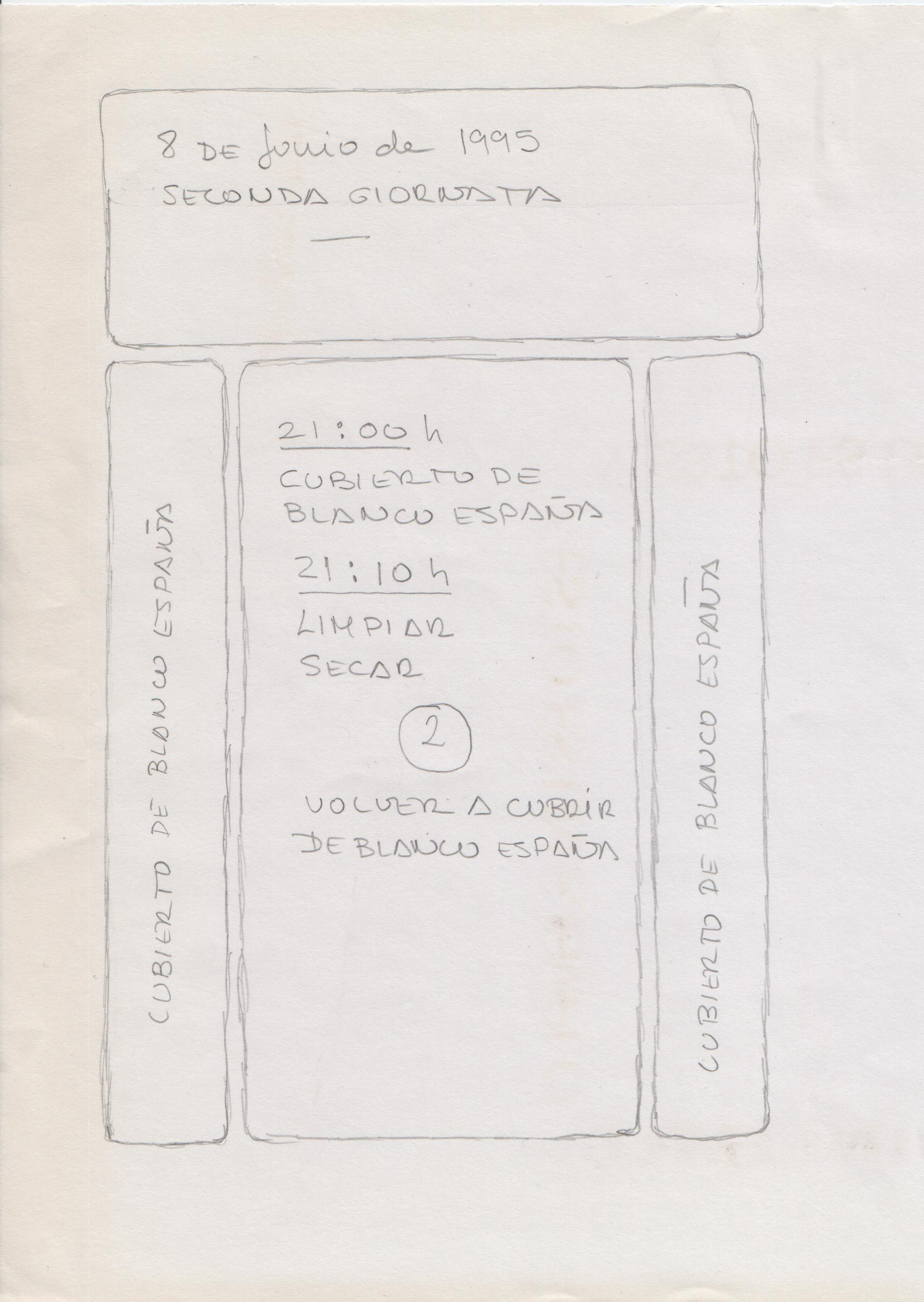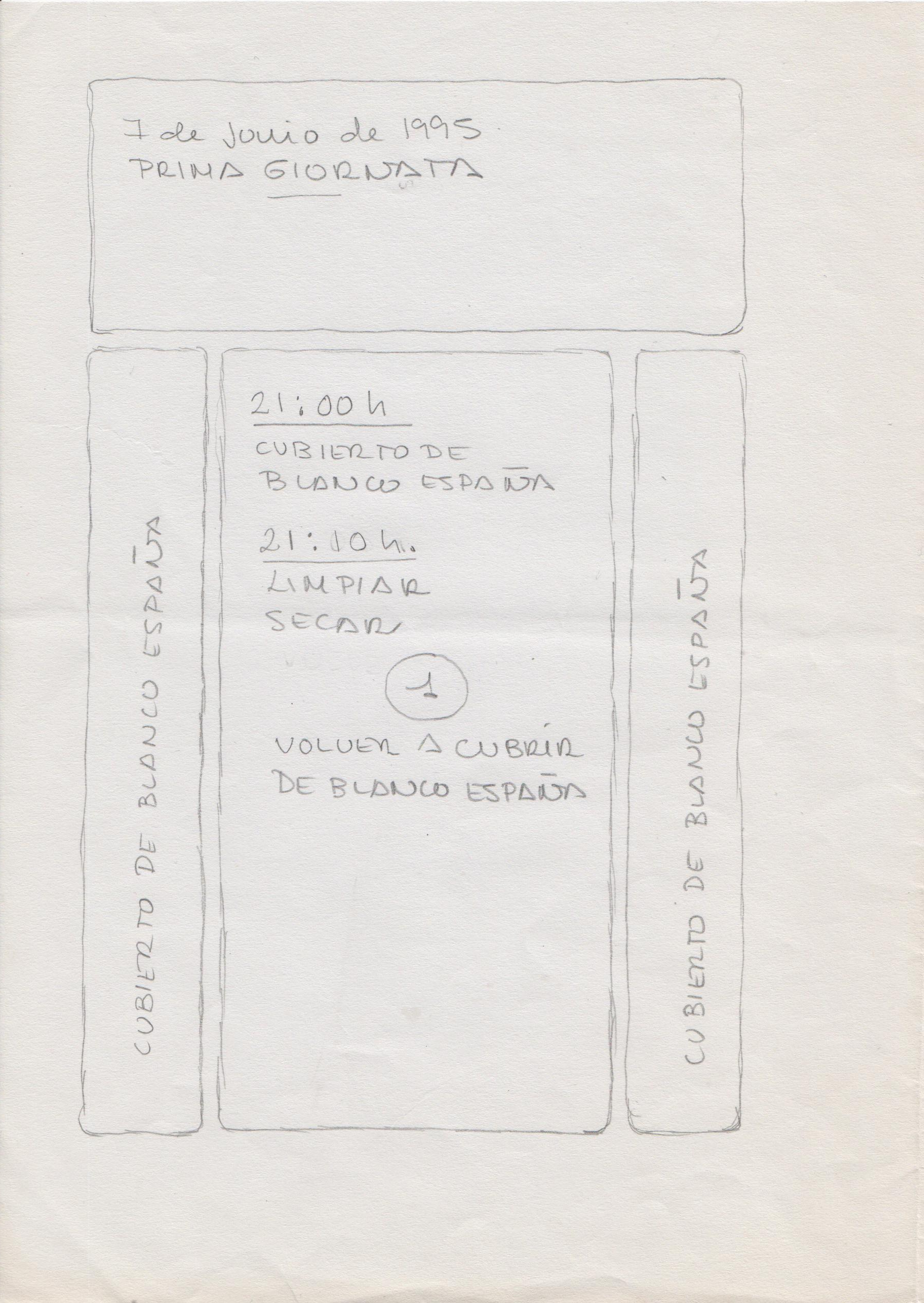 “Blanco España” fue una performance que transcurrió en tres jornadas: PRIMA GIORNATA, SECUNDA GIORNATA y TERZA GIORNADA. En cada jornada, desde dentro de la galería cerrada limpiaba el cristal de la puerta que estaba cubierto de blanco españa y lo volvía a tapar del mismo material para limpiarlo al día siguiente. El público contemplaba desde el exterior mi tarea.