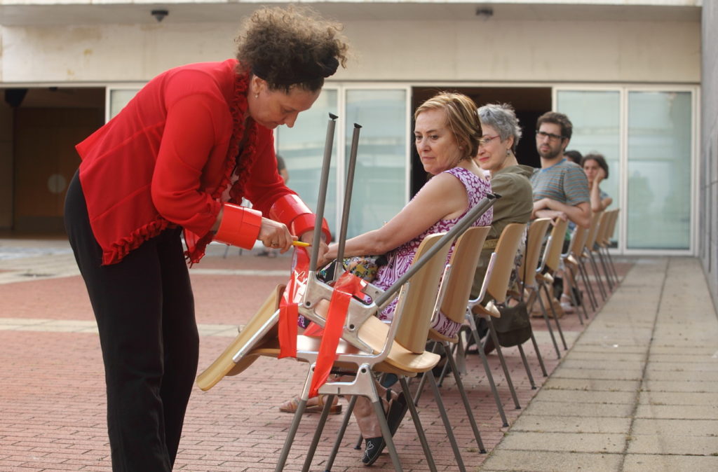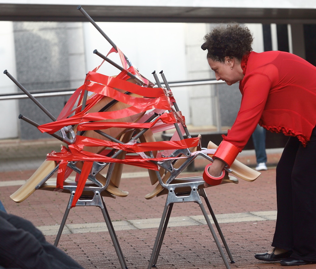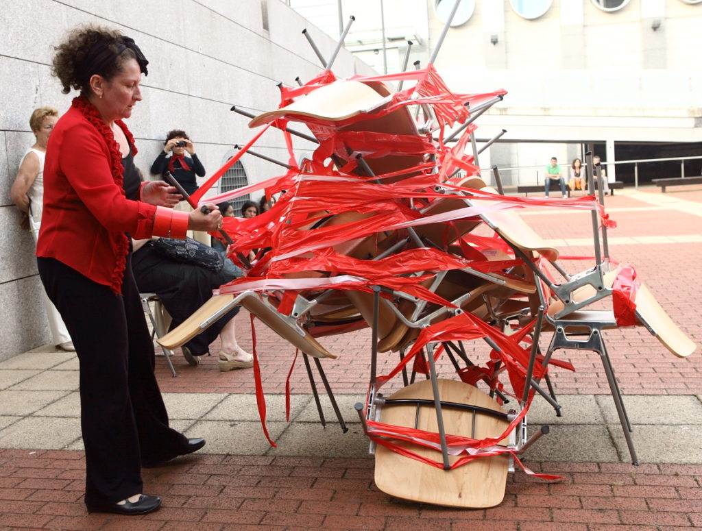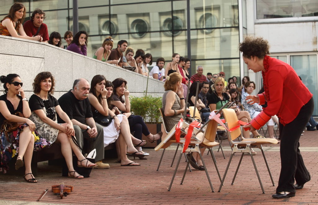 Nieves Correa presentó “Biografías del alma” en la plaza interna. Una mujer, un violín que recupera su sonido a duras penas, 20 sillas en hilera, y el incombustible esfuerzo del titán de la voluntad humana. Ella sola unió, entrelazó, pegó las sillas entre sí y las fue arrastrando como la piedra de Sísifo hasta lo alto de su montaña. Una acción interminable, inútil, en cuanto a su funcionalidad, titánica y extrema; se trataba, en suma, de la repetición hasta la extenuación de una acción que sólo tiene el compromiso de acabarse del mismo modo que se inicia: en silencio y con la aparente indiferencia del actor que no se inmuta, sólo ejecuta.