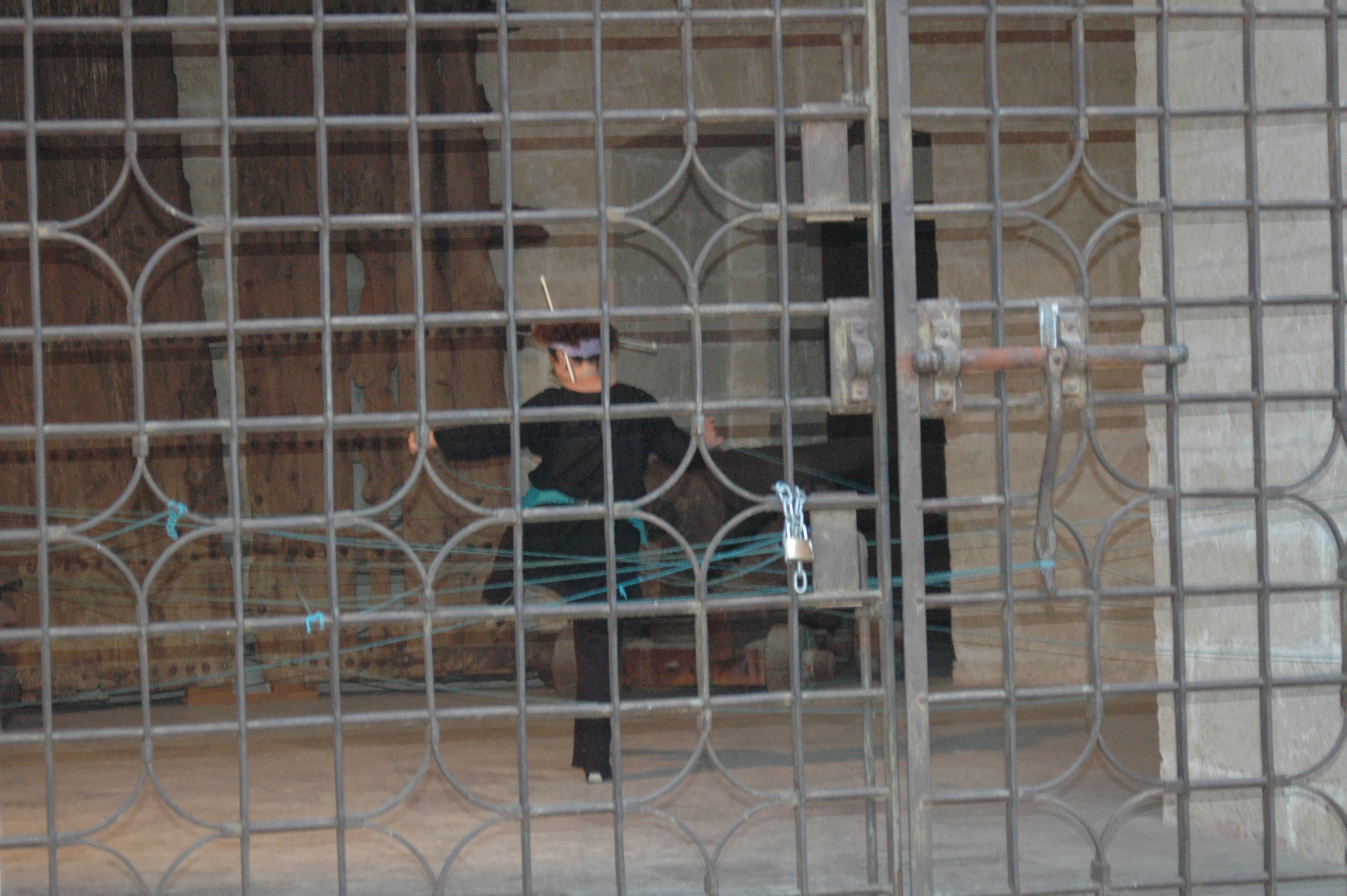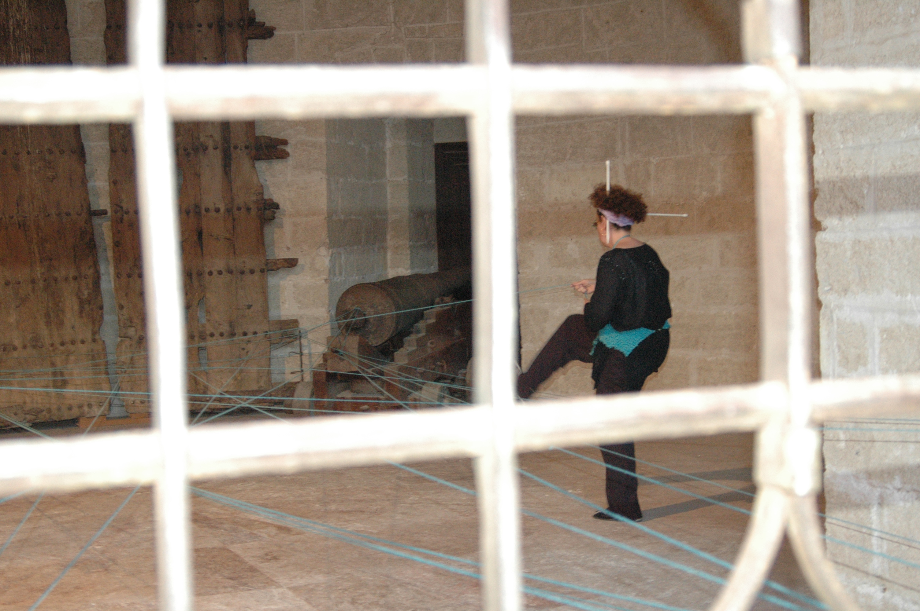 Según voy deshaciendo el delantal y el diseño de la red se va complicando tengo que saltar por los hilos para desplazarme por el espacio, es un trabajo bastante físico.