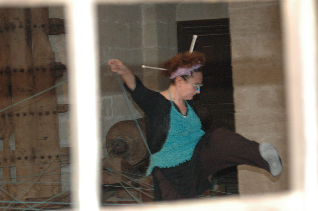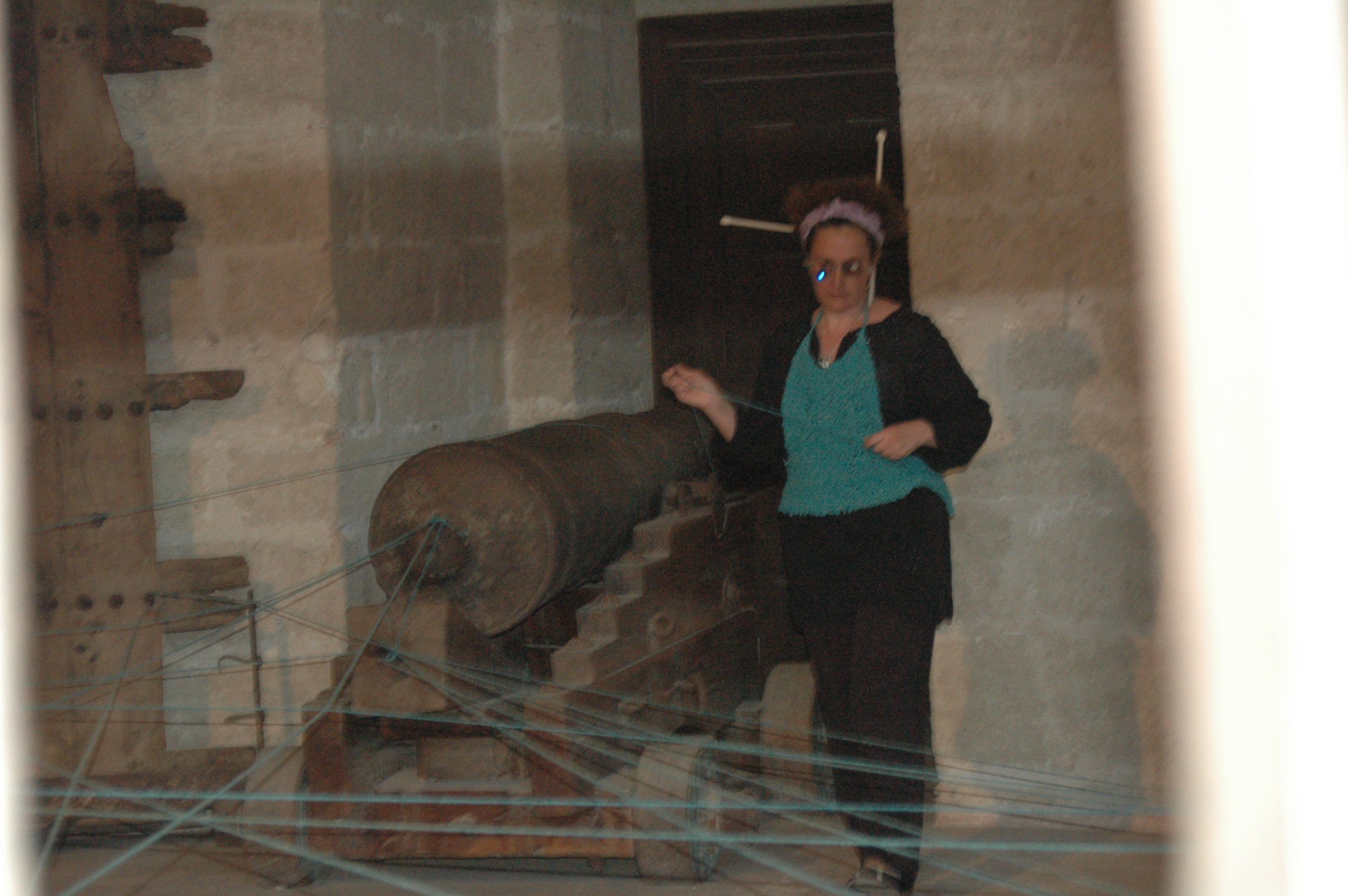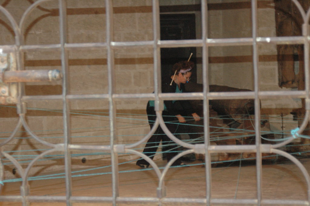 Recojo mi pelo con las propias agujas de tejer y empiezo a deshacer el delantal enganchando la lana en los elementos del espacio de forma que creo una especie de tela de araña.