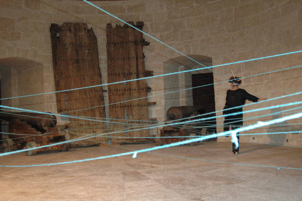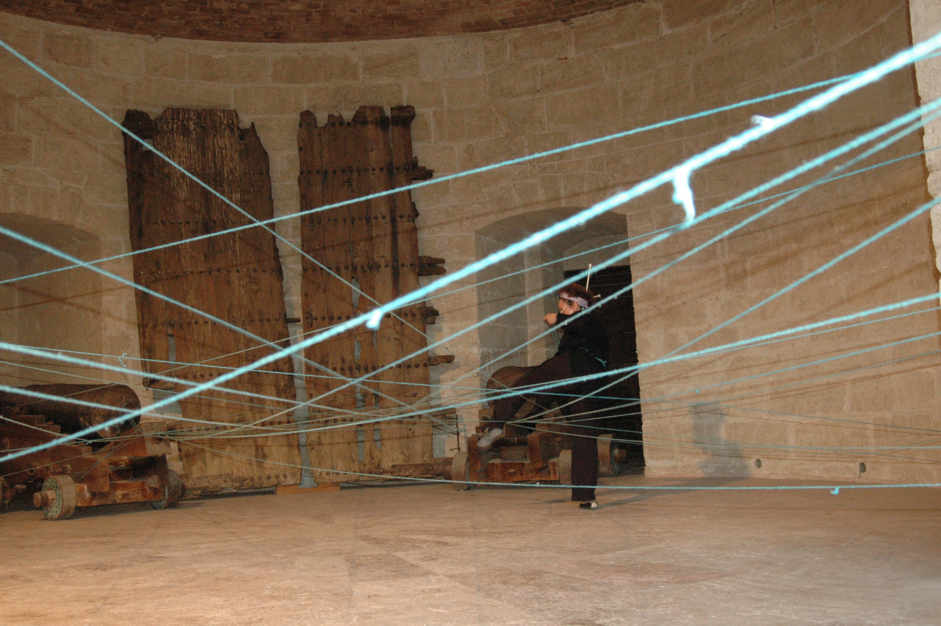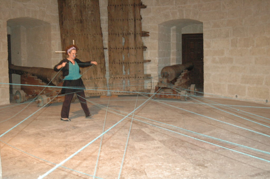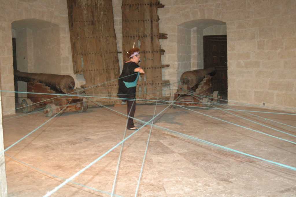 La “presentación pública” de la performance puede ser en cualquier lugar: sala o espacio público. El único requisito es que tenga algunos elementos donde enganchar la lana de mi delantal mientras lo deshago.