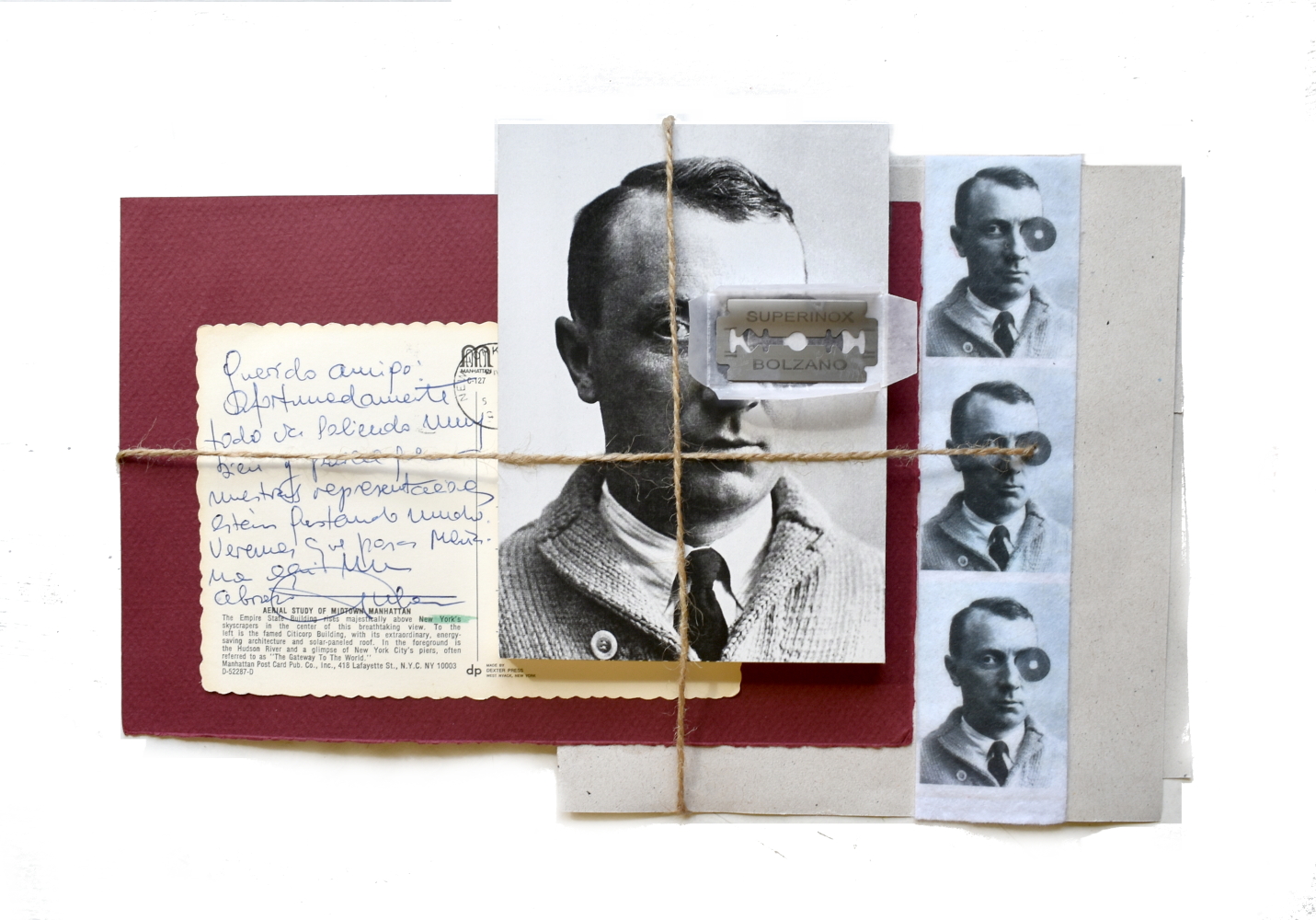 Técnica: Fotografía de Jean Arp con monóculo Dada intervenida con papel de color, postal manuscrita, cuerda e imágenes de Jean Arp con monóculo Dada sobre fieltro blanco