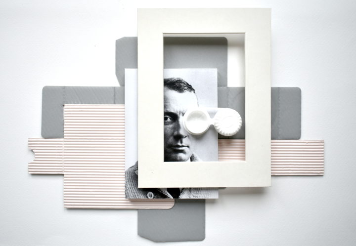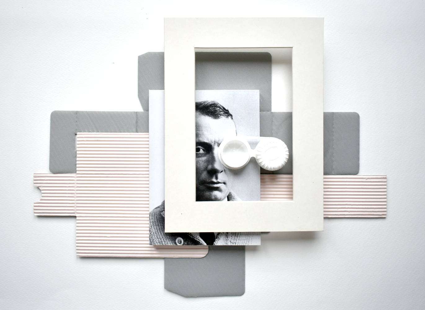 Técnica: Fotografía de Jean Arp con monóculo Dada intervenida con cartón ondulado y liso de color, paspartú y caja para lentillas