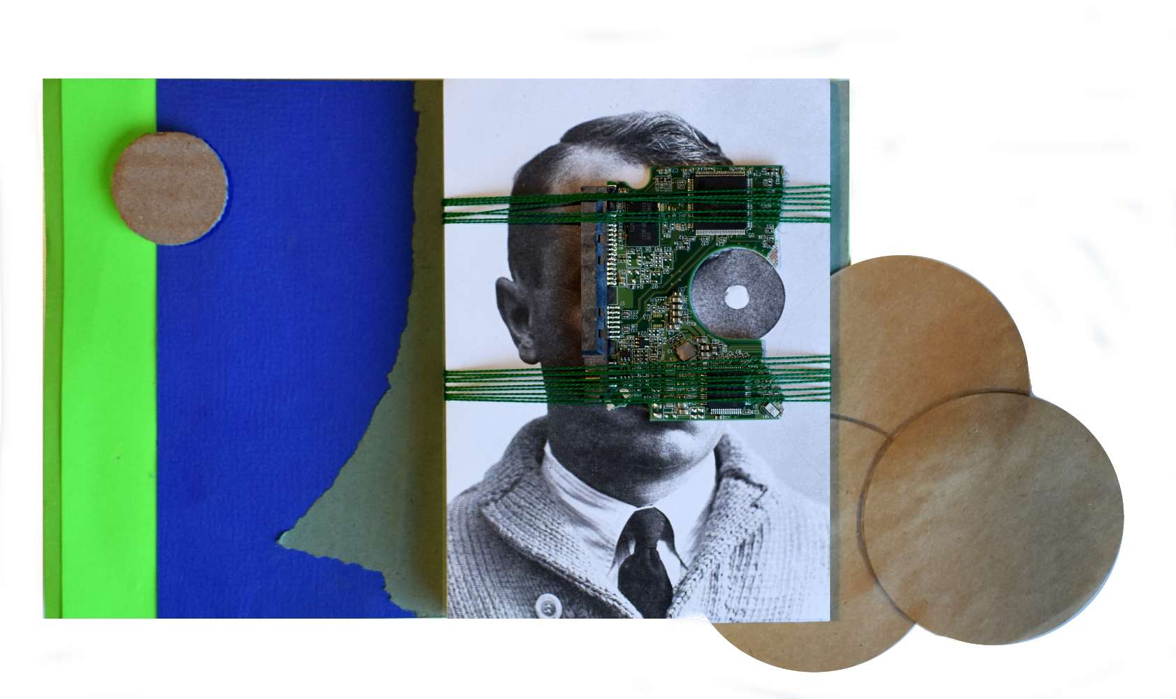 Técnica: Fotografía de Jean Arp con monóculo Dada intervenida con placa de computador, hilos y papeles de colores