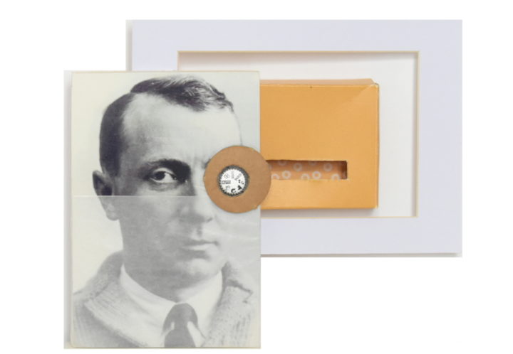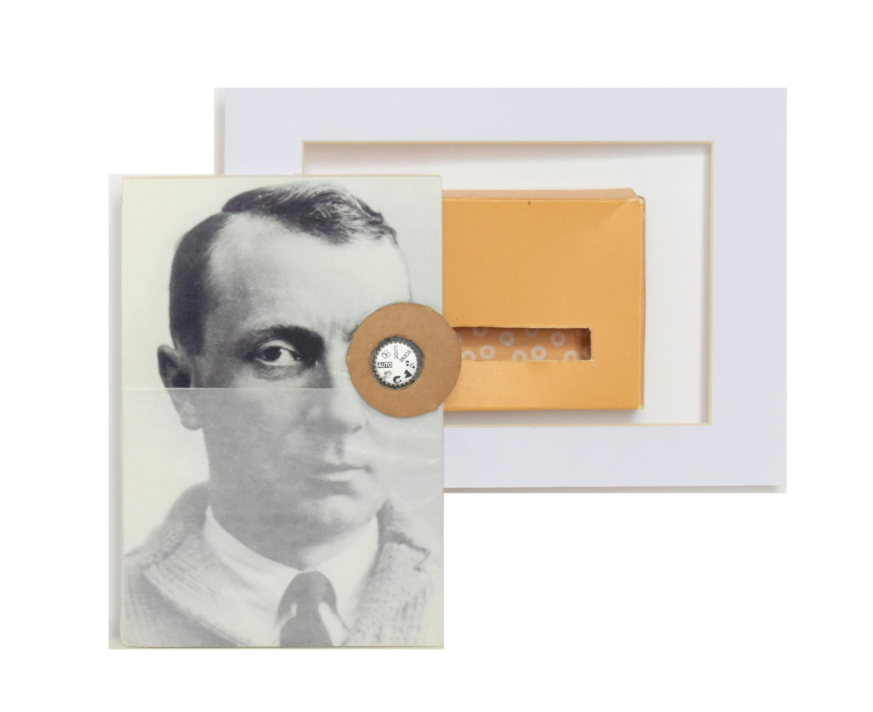 Técnica: Fotografía de Jean Arp con monóculo Dada intervenida con cartón, papel, caja de cartón y elemento de cámara fotográfica