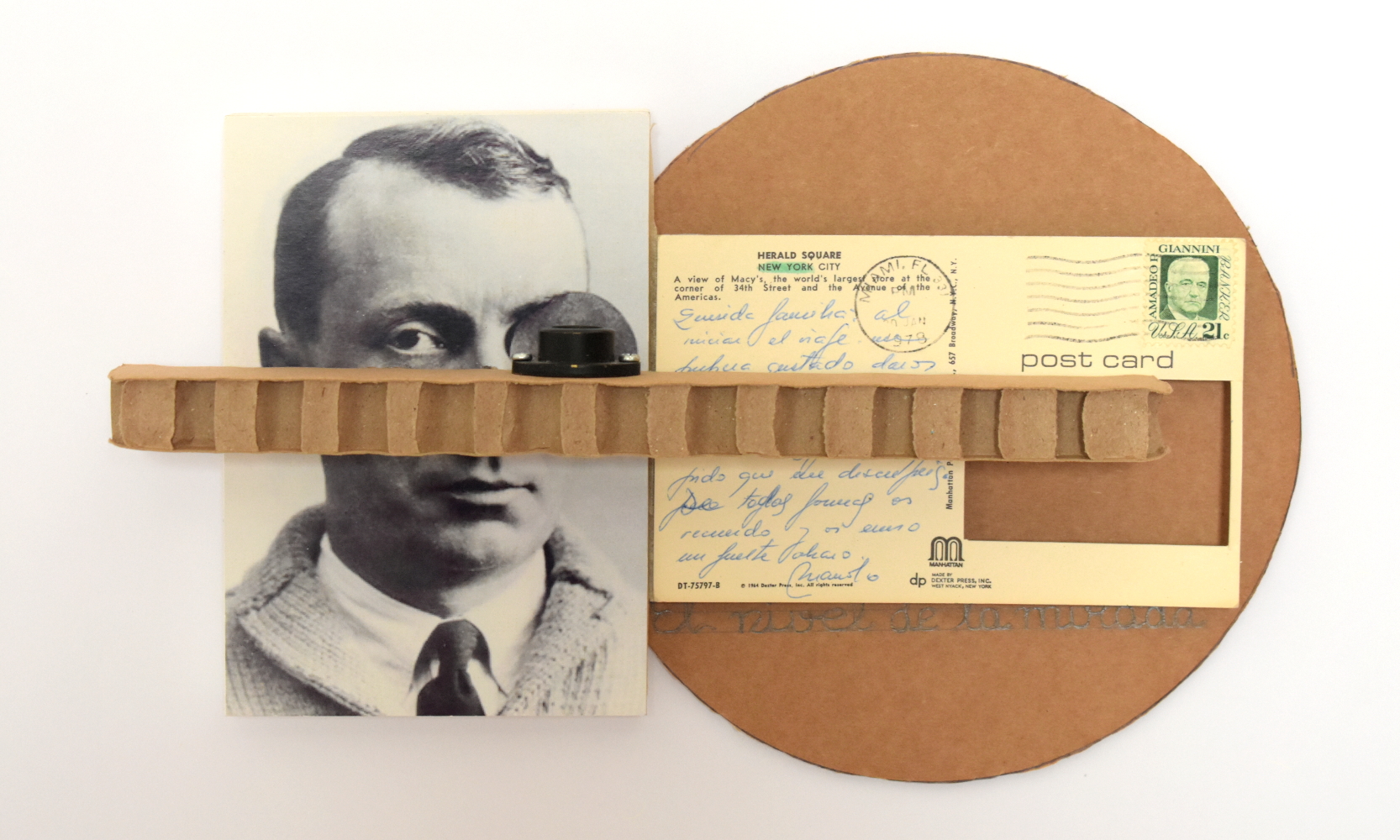 Técnica: Fotografía de Jean Arp con monóculo Dada intervenida con cartón, nivel, postal vintage y lápiz.