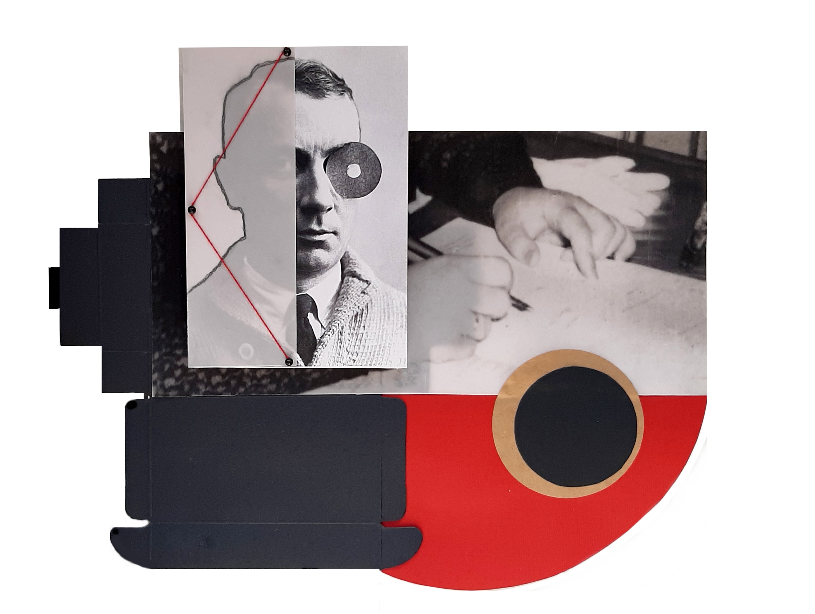 Técnica:  Fotografía de Jean Arp con monóculo Dada intervenida con alfileres, hilo rojo, lápiz de grafito,caja de cartón y papeles de colores.