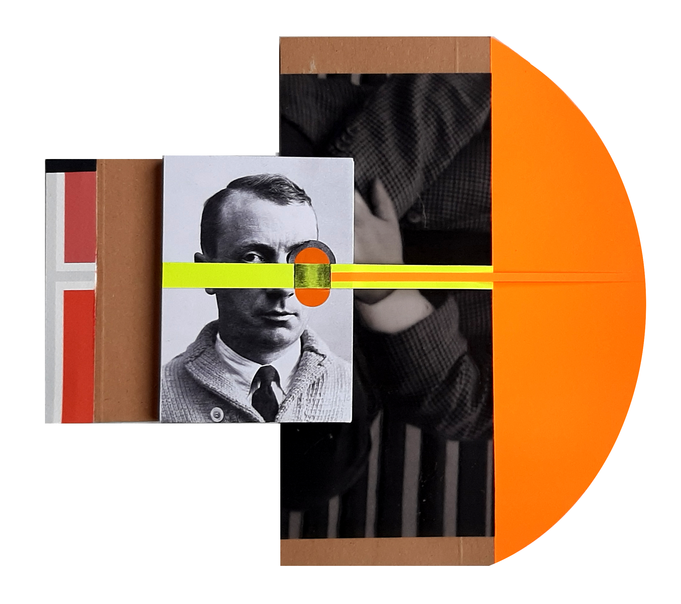 Técnica: Fotografía de Jean Arp con monóculo Dada intervenida con cartones, papeles de colores e impresión sobre acetato.