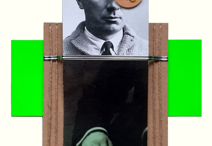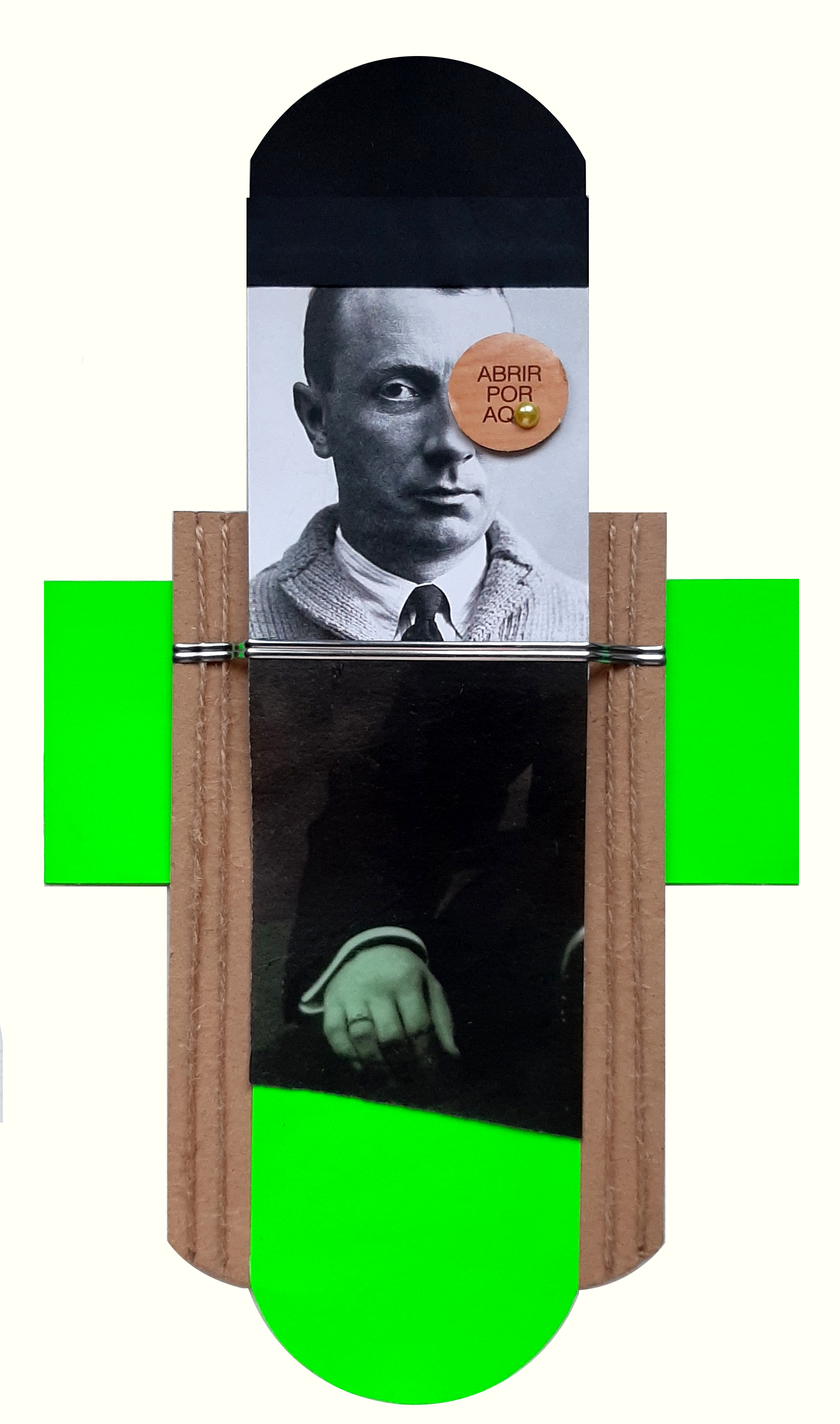Técnica:  Fotografía de Jean Arp con monóculo Dada intervenida con cartones, papeles de colores, papel de acetato, cuerda y tira de plomo