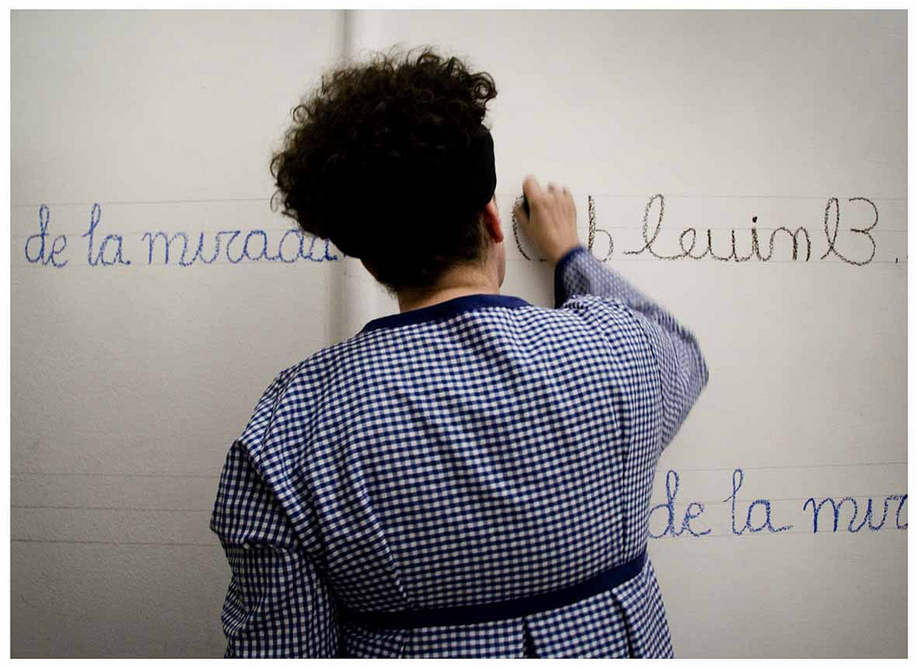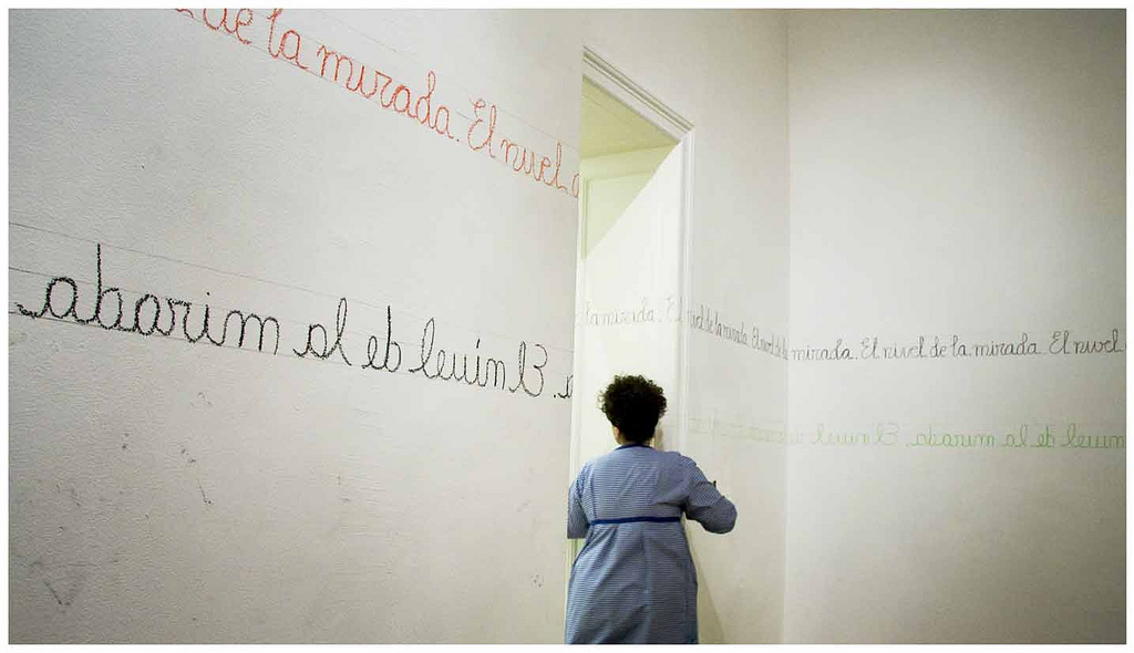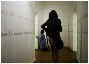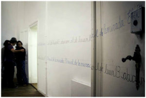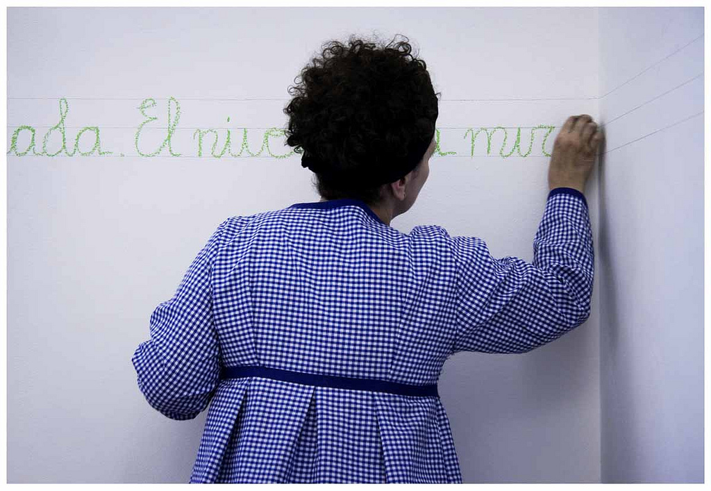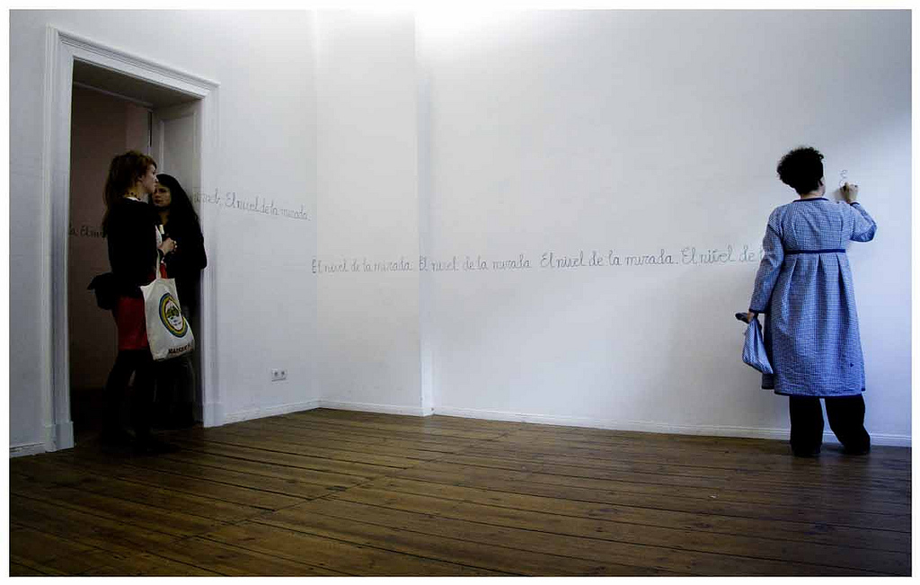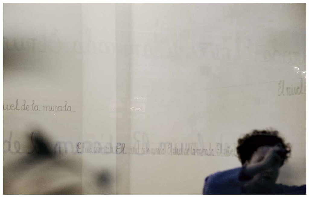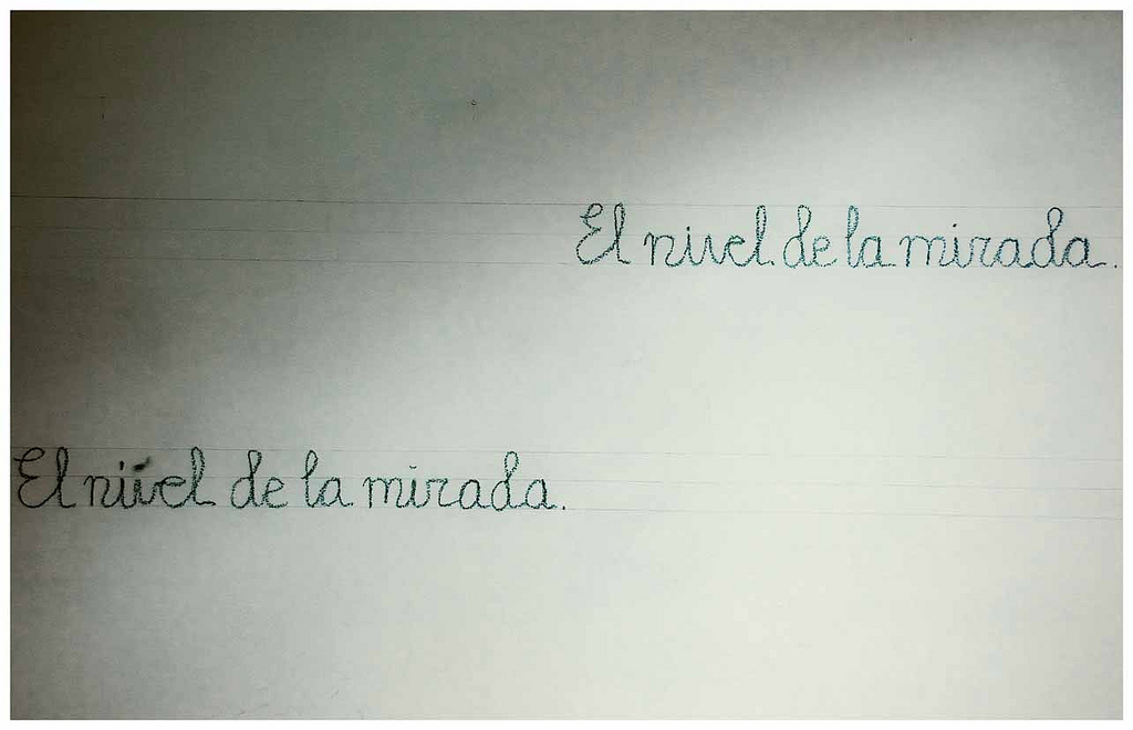 El día señalado para la presentación de la performance me dediqué a escribir la frase: “El nivel de la mirada”, imitando al escritura de los cuadernos de caligrafía infantiles en las dos pautas previamente dibujadas, de pie y de rodillas hasta terminar de completar la tarea.