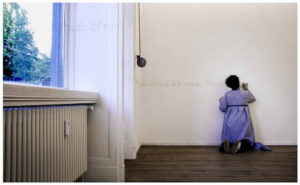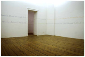 El trabajo previo consistió en dibujar alrededor de todo el espacio del que disponía en el Grimmuseum dos pautas paralelas. Una al nivel de mio ojos estando de pie, la otra al nivel de mis ojos estando de rodillas. La pauta medía ocho centímetros.