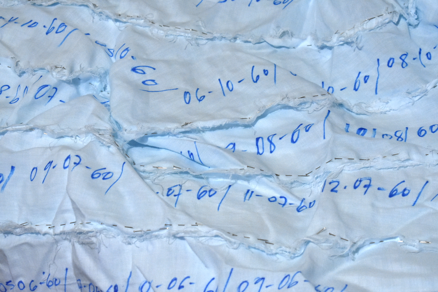 Técnica: 242 Fotografías en blanco, negro y azul 10 x 15, maniquí de costura y vestido de algodón reconstruido con alfileres.