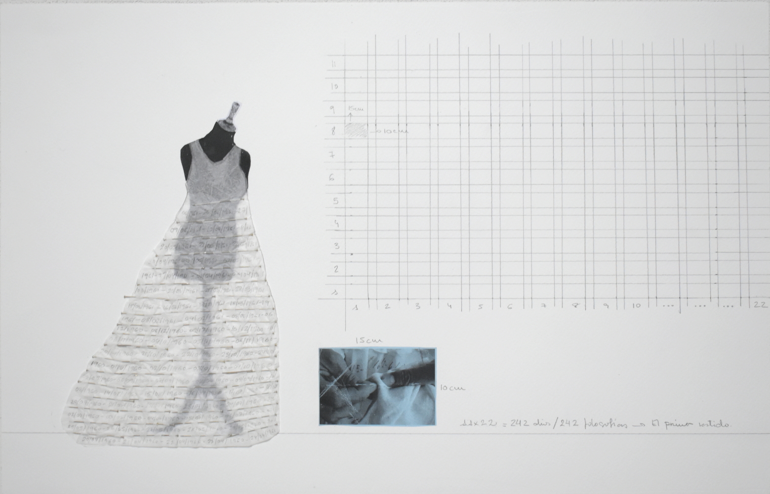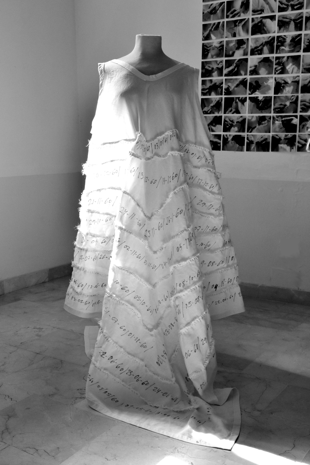“El Primer Vestido” está hecho de 242 días que comienzan el 20 de abril de 1960. El vestido se hizo, se deshizo y volvió a hacerse en la performance “El Primer Vestido”, después volvió a deshacerse y en el nuevo proceso de reconstrucción se tomaron 242 fotografías de su montaje, una por cada día que lleva escrito el vestido. Algunos días se repiten, otros se omiten…. el vestido no es exacto; es un vestido en “tiempo real”.