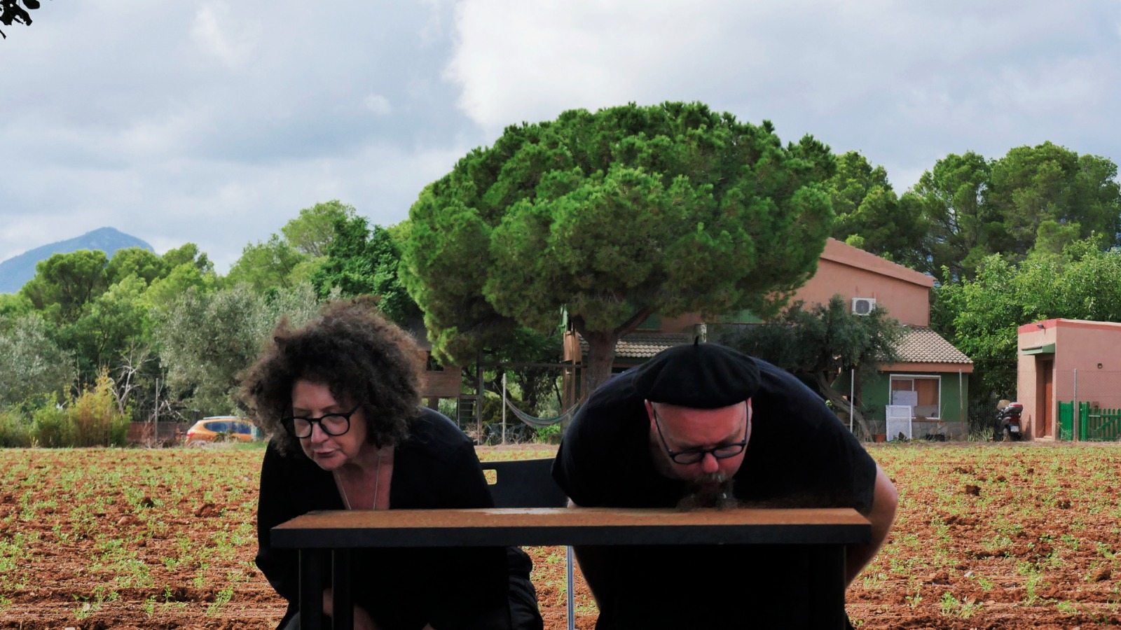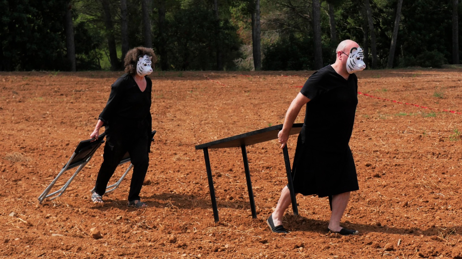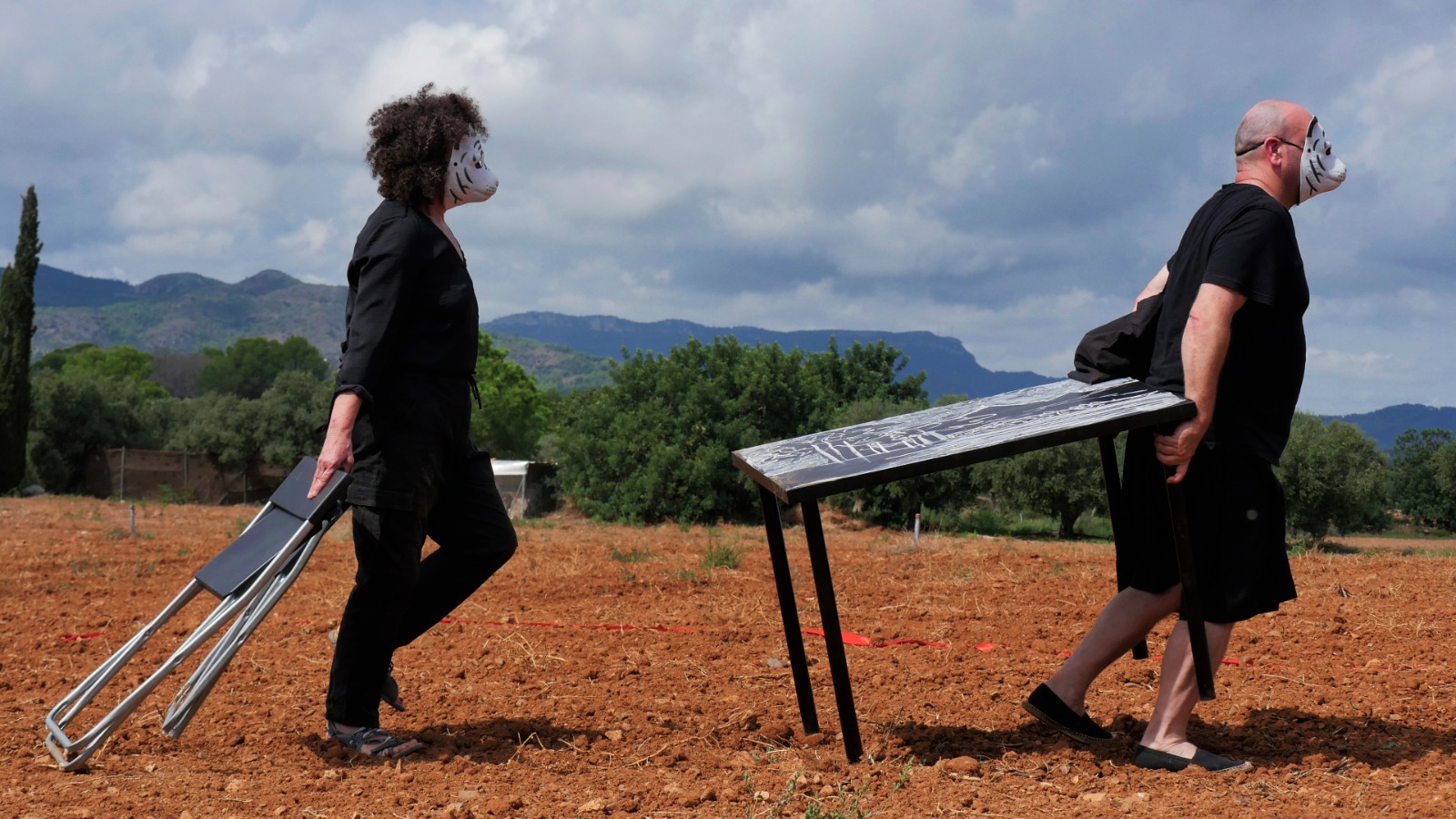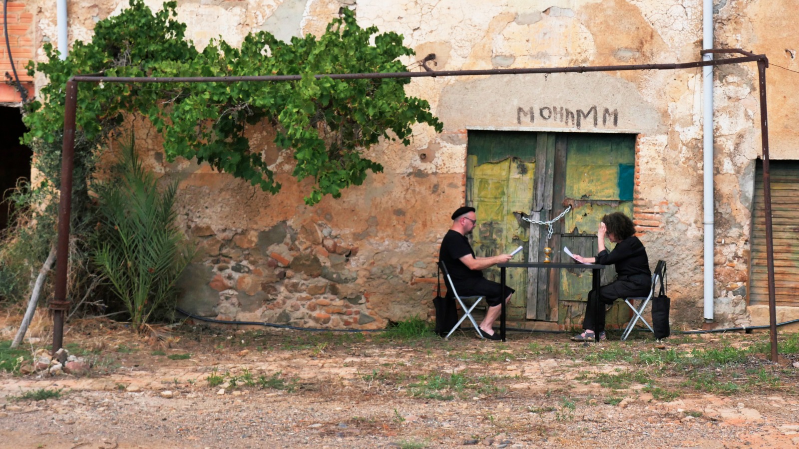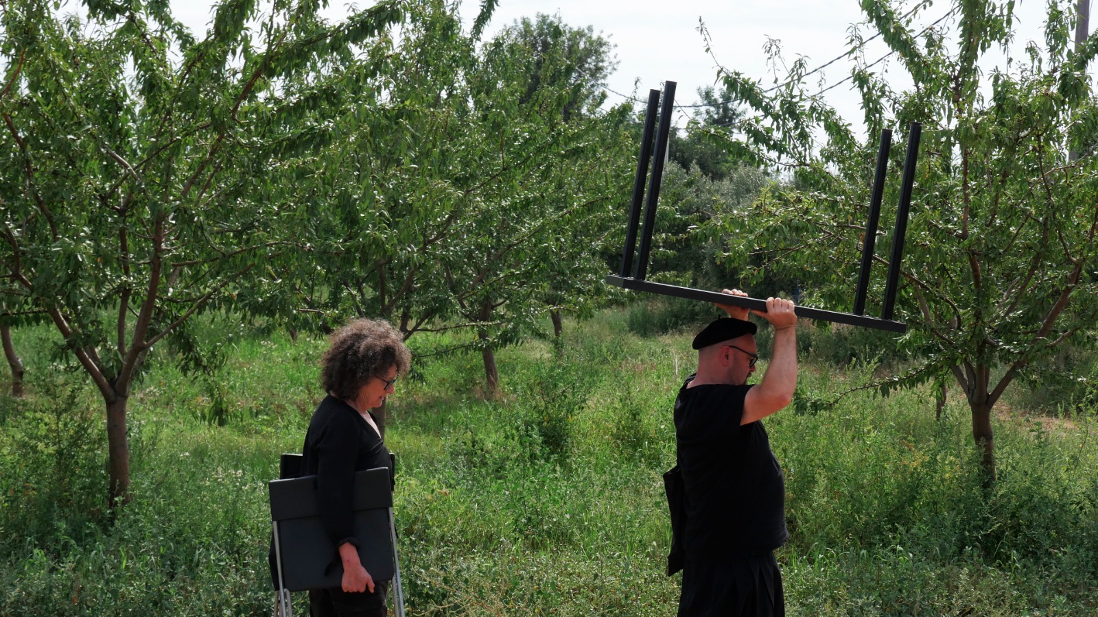 Provistos de una mesa y dos sillas plegables negras nuestro particular “viaje interior” recorre los espacios en los que se desarrolla el Festival Partides 2025 señalando rincones inesperados, detalles de ruinas, árboles y naturaleza, piedras y descampados en un recorrido previamente trazado en el que nos acompañaron todos los asistentes que así lo deseen.