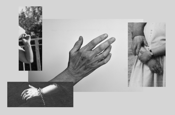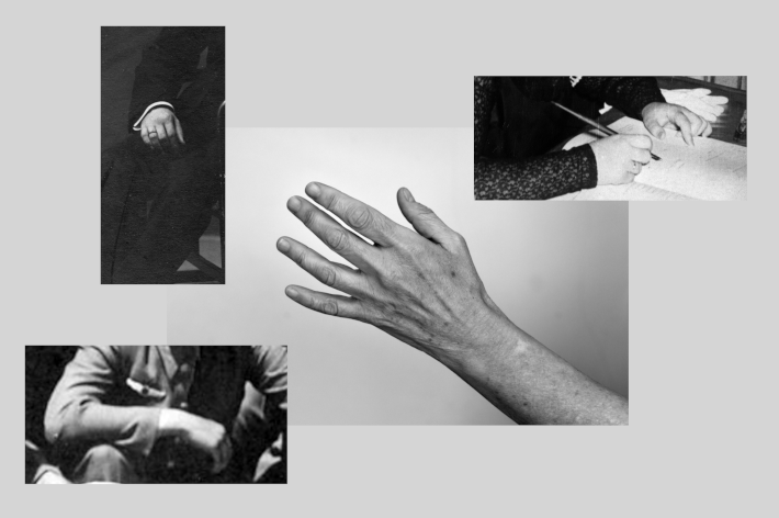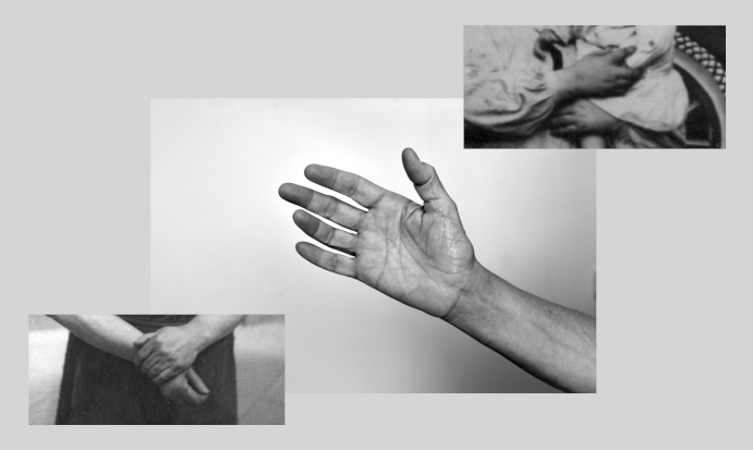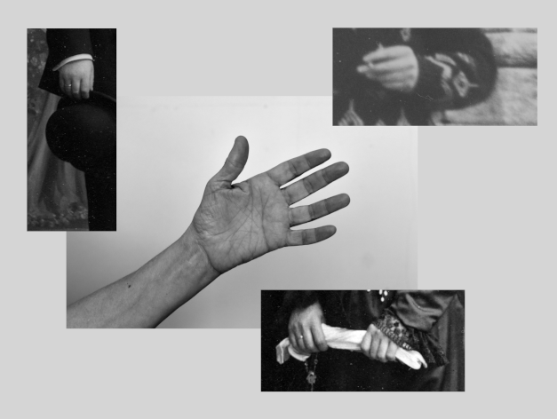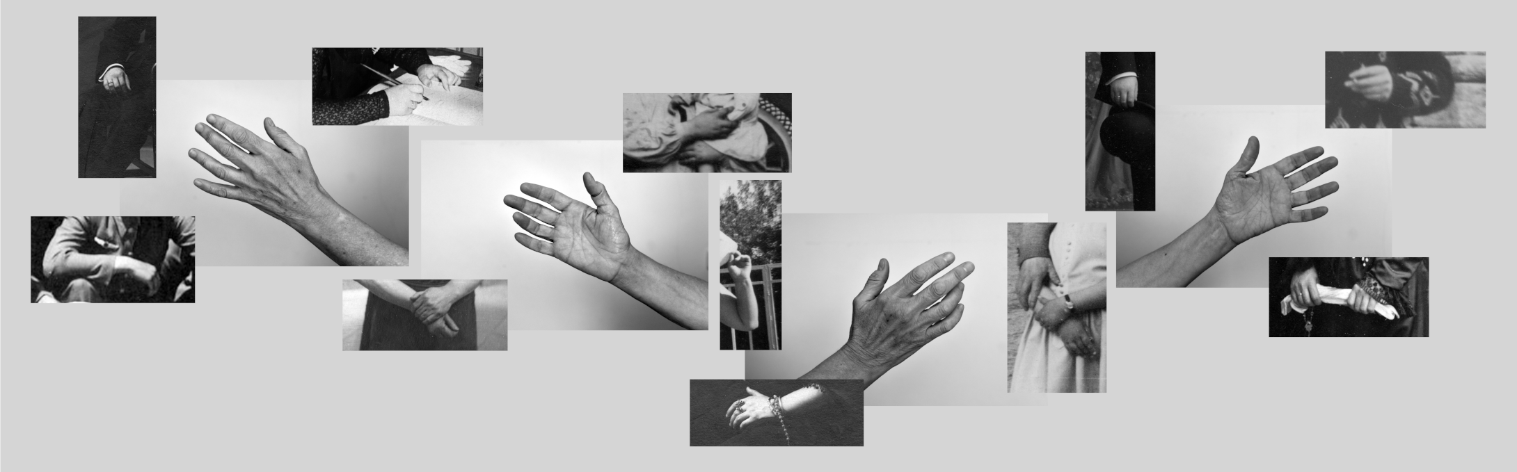4 Fotomontajes compuestos  cada uno por una fotografía de mi mano y entre 2 y 3 fotografías históricas ampliadas reproducidas sobre papel Hahnemuhle Photo Matt Fibre 200 gr. Cada pieza está montada sobre cartón de paspartú de 2 mm.