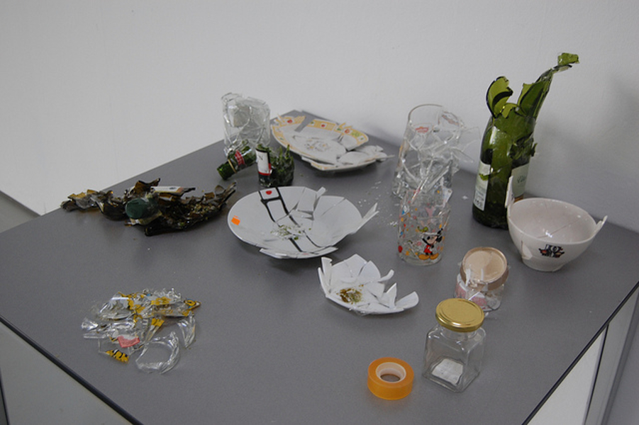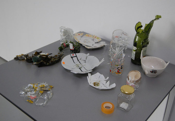 Siempre me ha interesado la imagen de los objetos cotidianos que se rompen, en este trabajo intento reconstruir los objetos que previamente he destruído tirándolos con saña al suelo.
