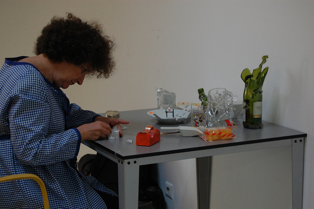 Como en muchas de mis performances me enfrento a una tarea que nunca he hecho antes, recontruir con cinta adhesiva normal y corriente platos, vasos, botellas, fuentes y tarros que pueden hacerse añicos o no en el proceso de destrucción.