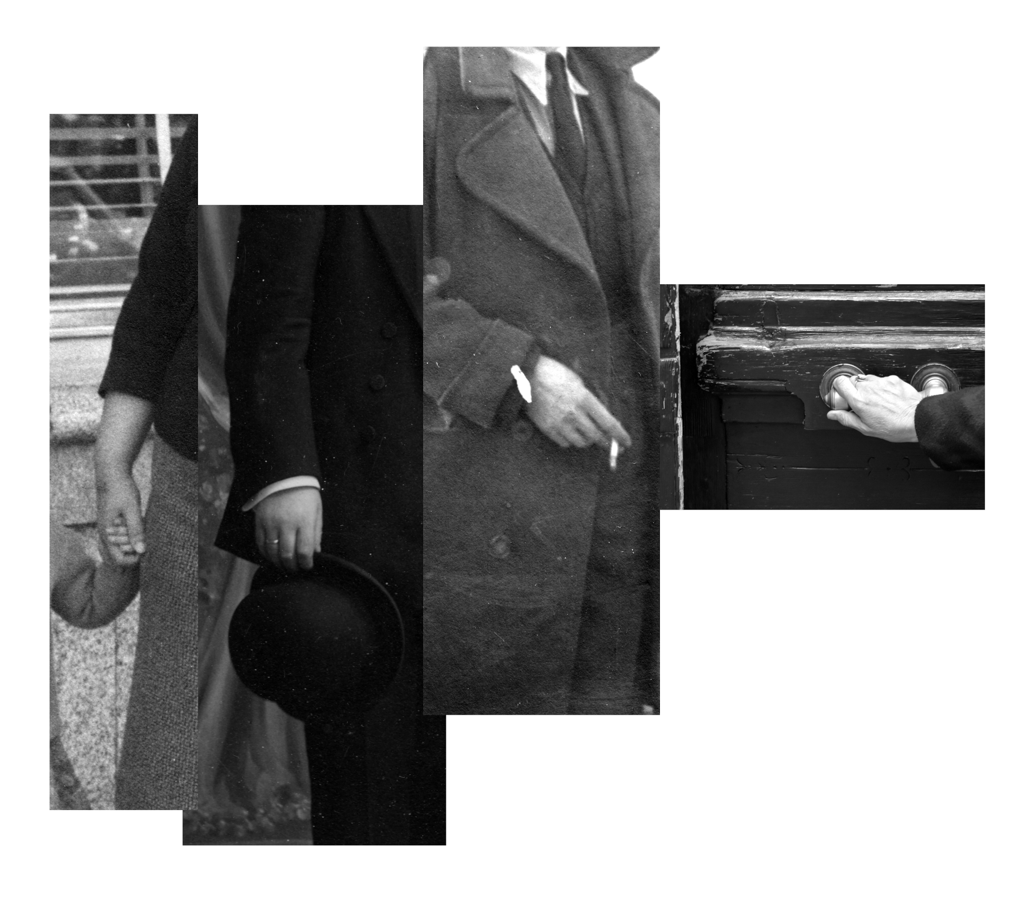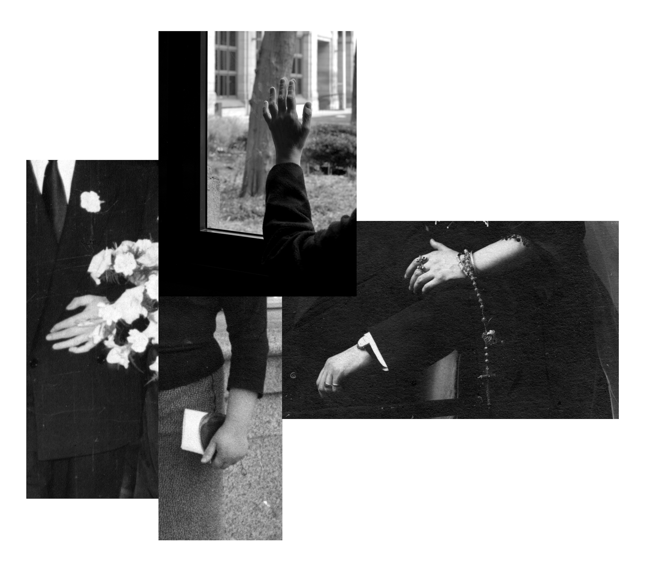 Las fotografías actuales se han tomado en lugares especialmente importantes en la historia de mi familia y en relación a mi misma: mi mano izquierda abre la puerta de la casa donde mi familia vivió durante mas de cien años y en la que yo nací. Mi mano derecha descansa sobre una de las ventanas del MNCARS donde estudió mi abuelo materno y que tanta relación tiene con mi trabajo. Mis pies están en el lugar exacto en el que murió mi tío Rafael durante un bombardeo en 1938.
