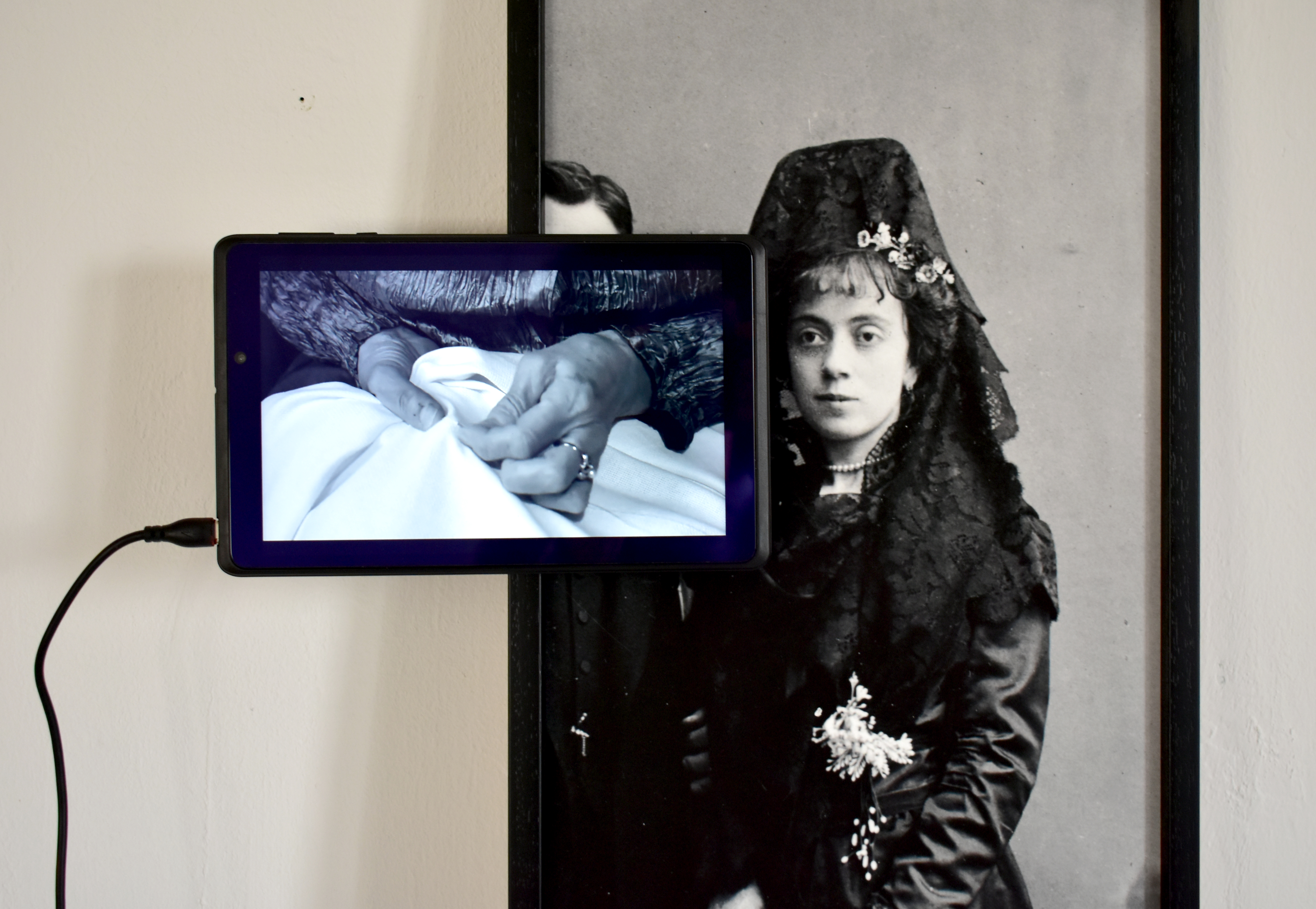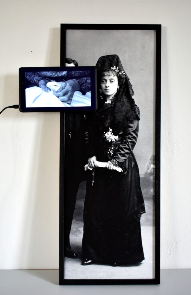 En el caso de N.F., mi abuela paterna, mis manos bordan su ajuar de boda mientras el audio reproduce también fragmentos de la Gymnopédie núm. 1 de Satie y nueve cartas que su futuro marido y algunas amigas la escriben. Todas estas cartas, tanto en el caso de Julia como en el de N.F. son cartas ficcionadas a partir de cartas originales de época y reproducidas por un traductor digital de texto a voz.