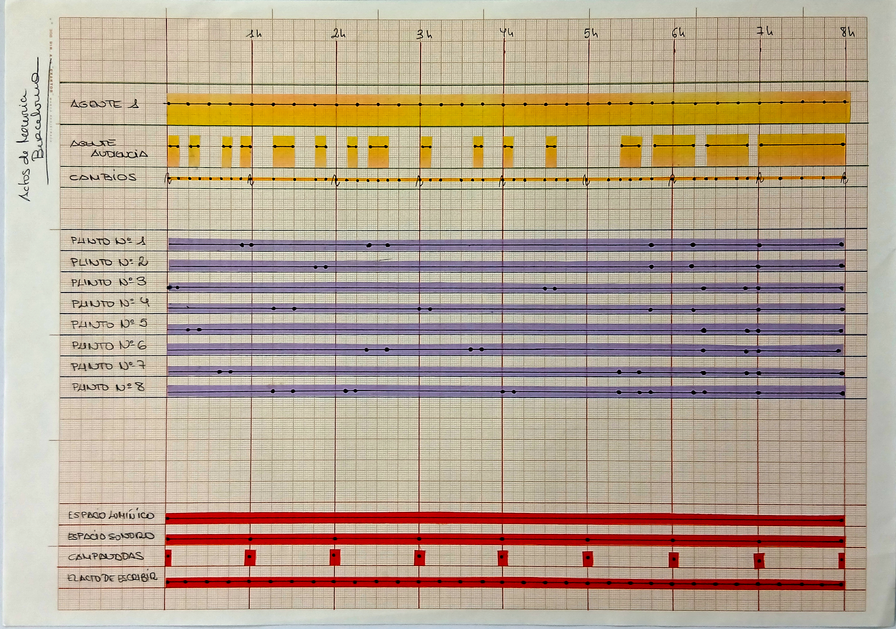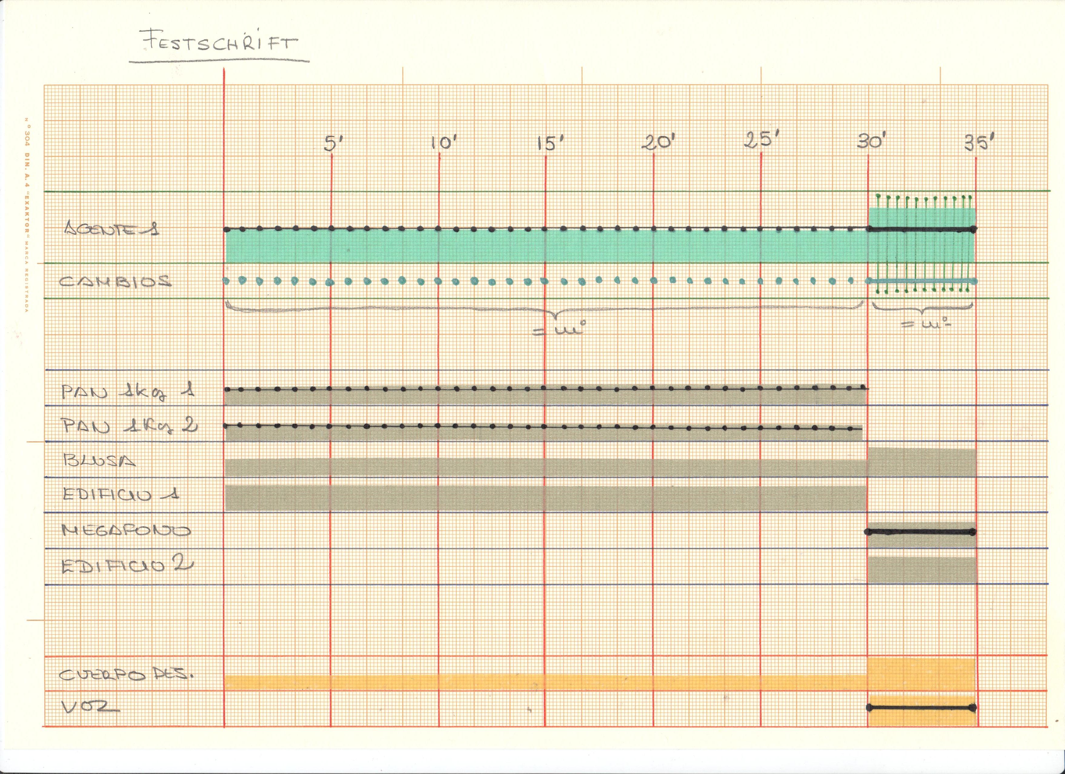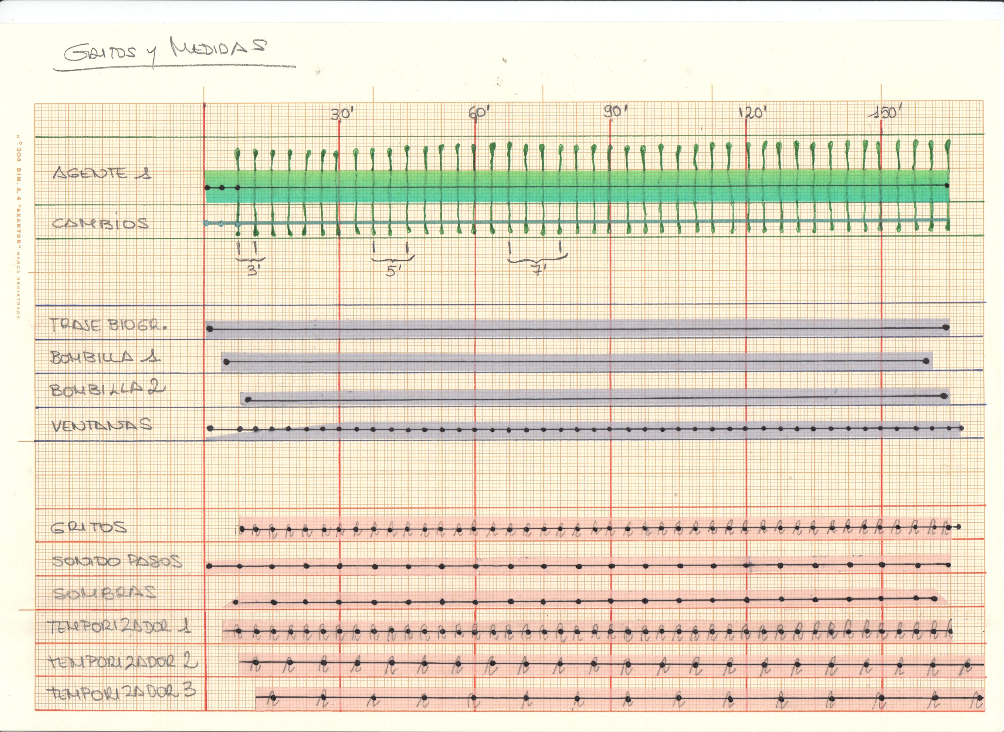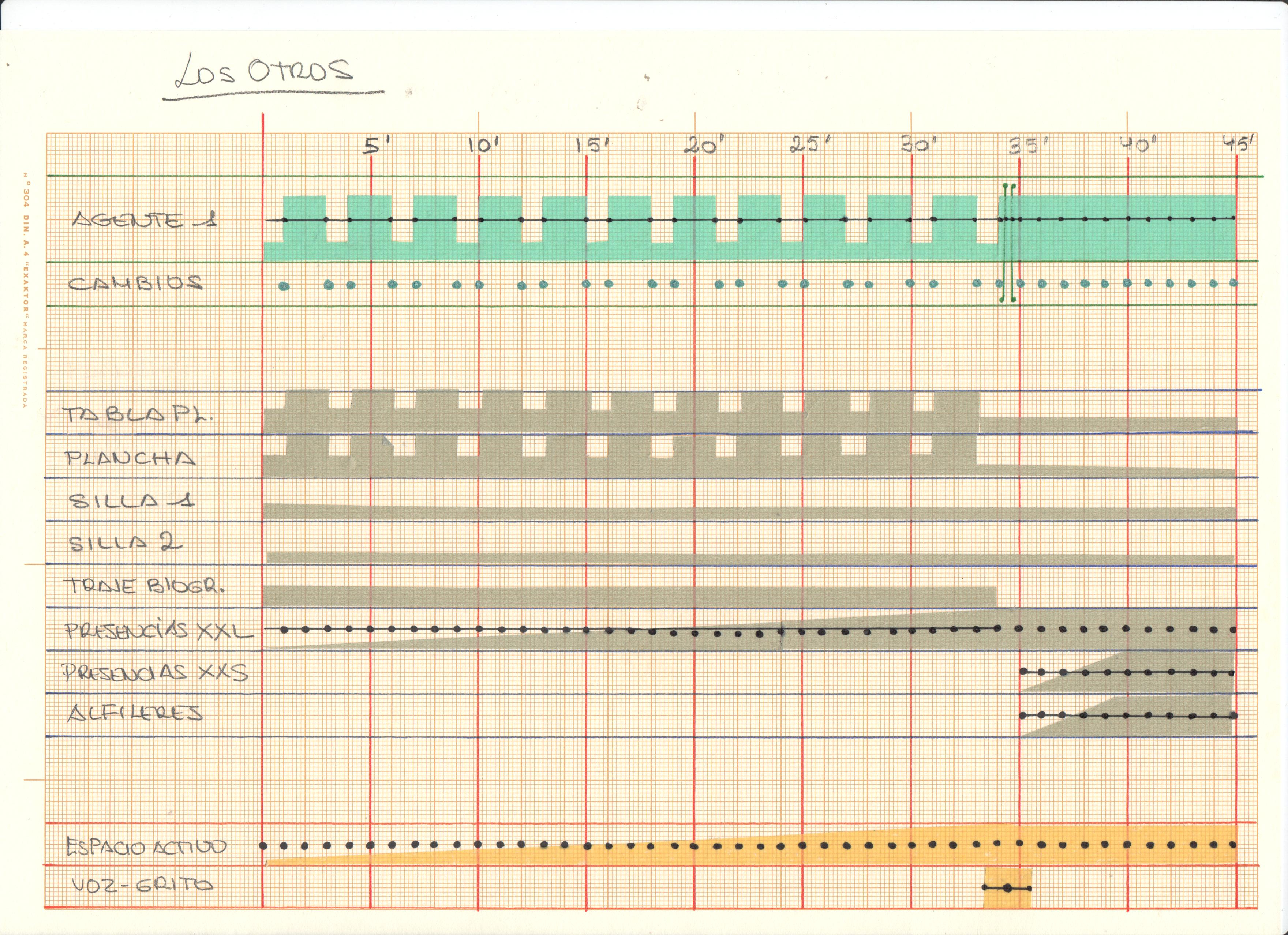 Un código en el que en una línea temporal se describen las internaciones, silencios, cambios e inflexiones de todos los elementos involucrados un una propuesta performativa, incluida la propia ejecutante o ejecutantes, y sin descripción narrativa.