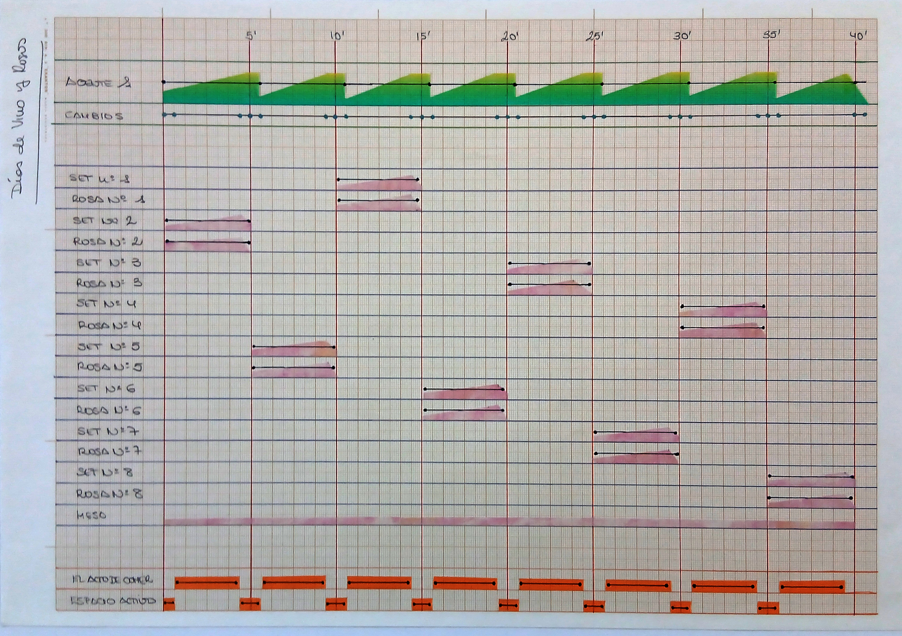 La base de esta exposición son lo que yo llamo mis “Partituras Visuales”, un sistema de notación lógico mediante el cual se pueda representar todas las variables que entran en juego a la hora de concebir una Performance de tal manera que teóricamente, igual que sucede en la música, esa partitura pueda ser interpretada por cualquiera que conozca el sistema.