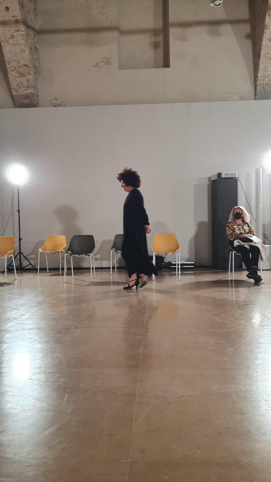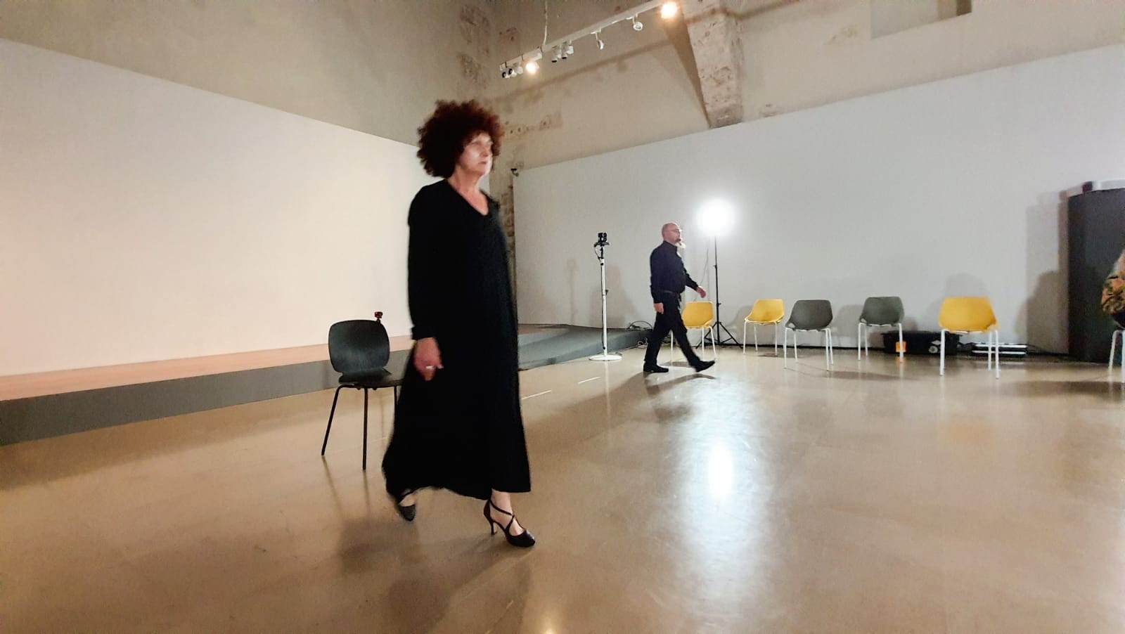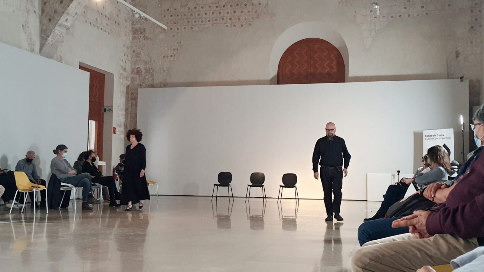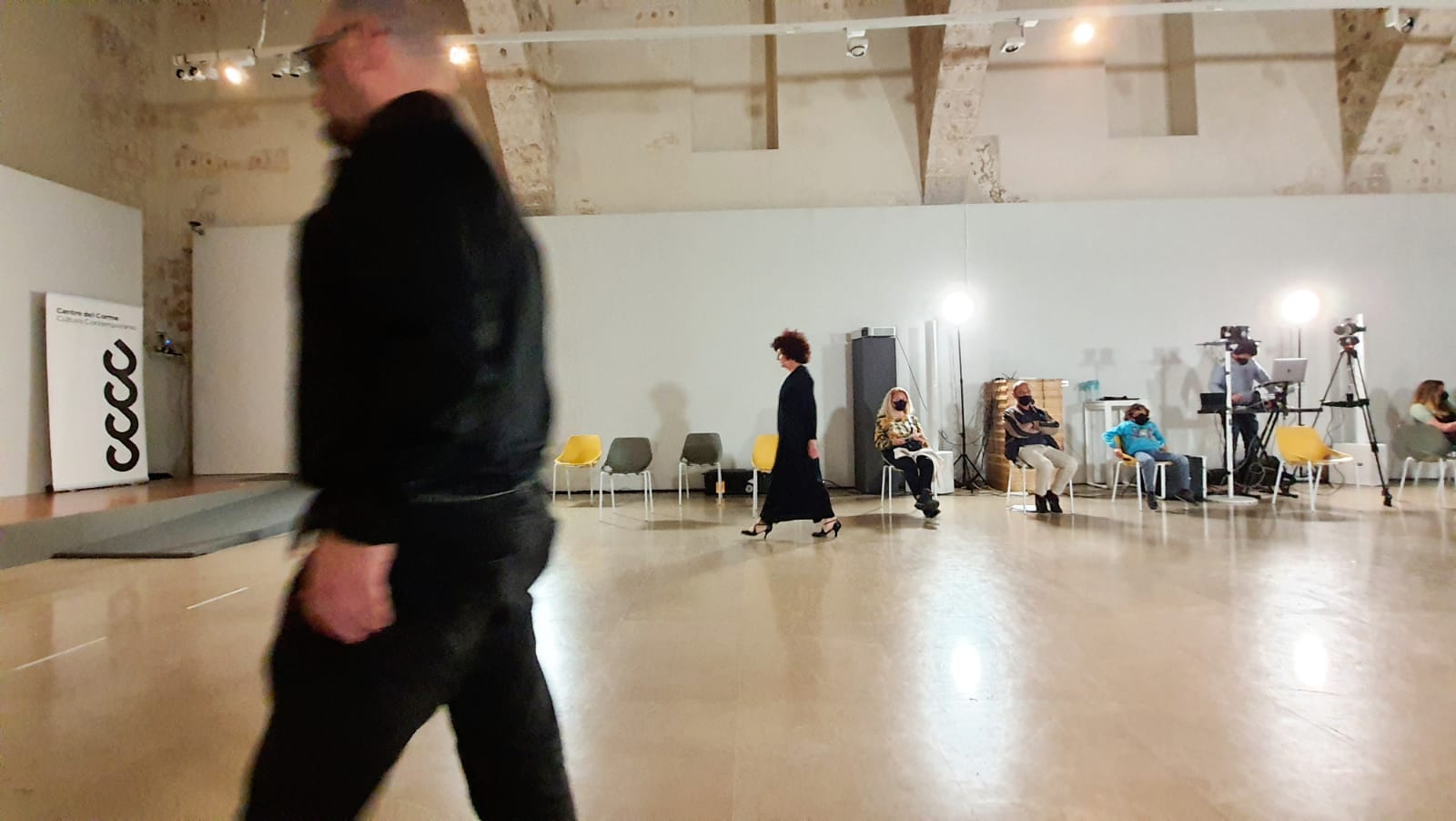 Aparte de este punto focal la acción se desarrolla también en los márgenes del espacio y en los márgenes del público reflexionando sobre los aspectos técnicos del propio dispositivo performativo.