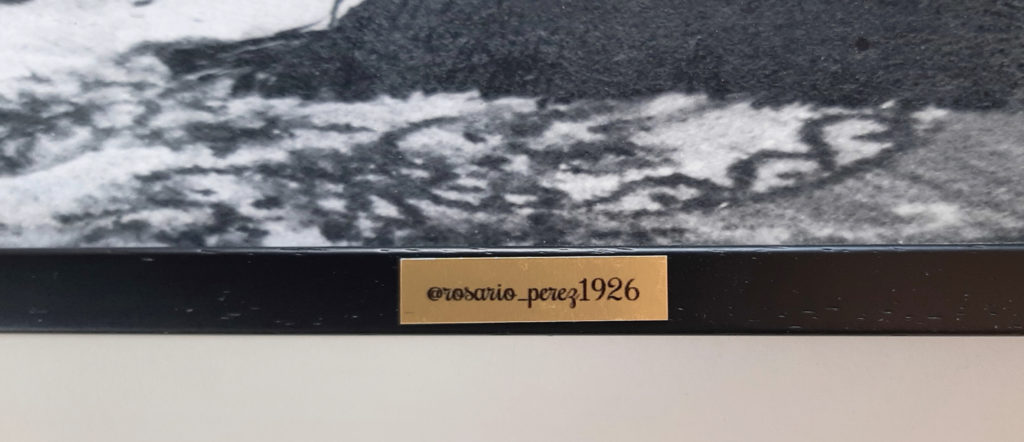 Una placa de aluminio a modo de título de su cuenta de instagram @rosario_perez1926