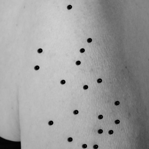 50 alfileres de cabeza negra pinchados en un alfiletero de muñeca. Coger uno a uno esos alfileres y clavarlos sobre mi hombro desnudo, después volver…