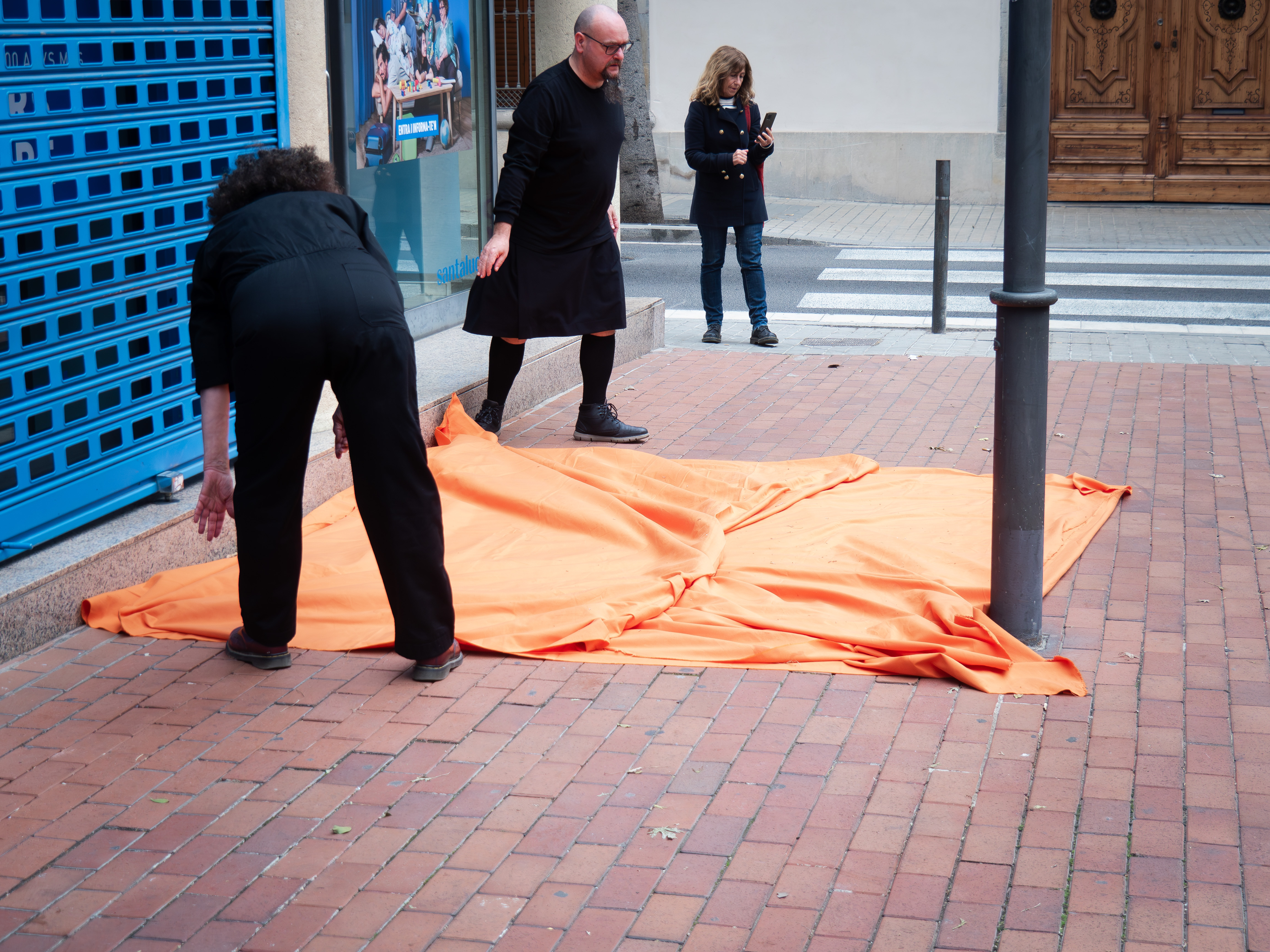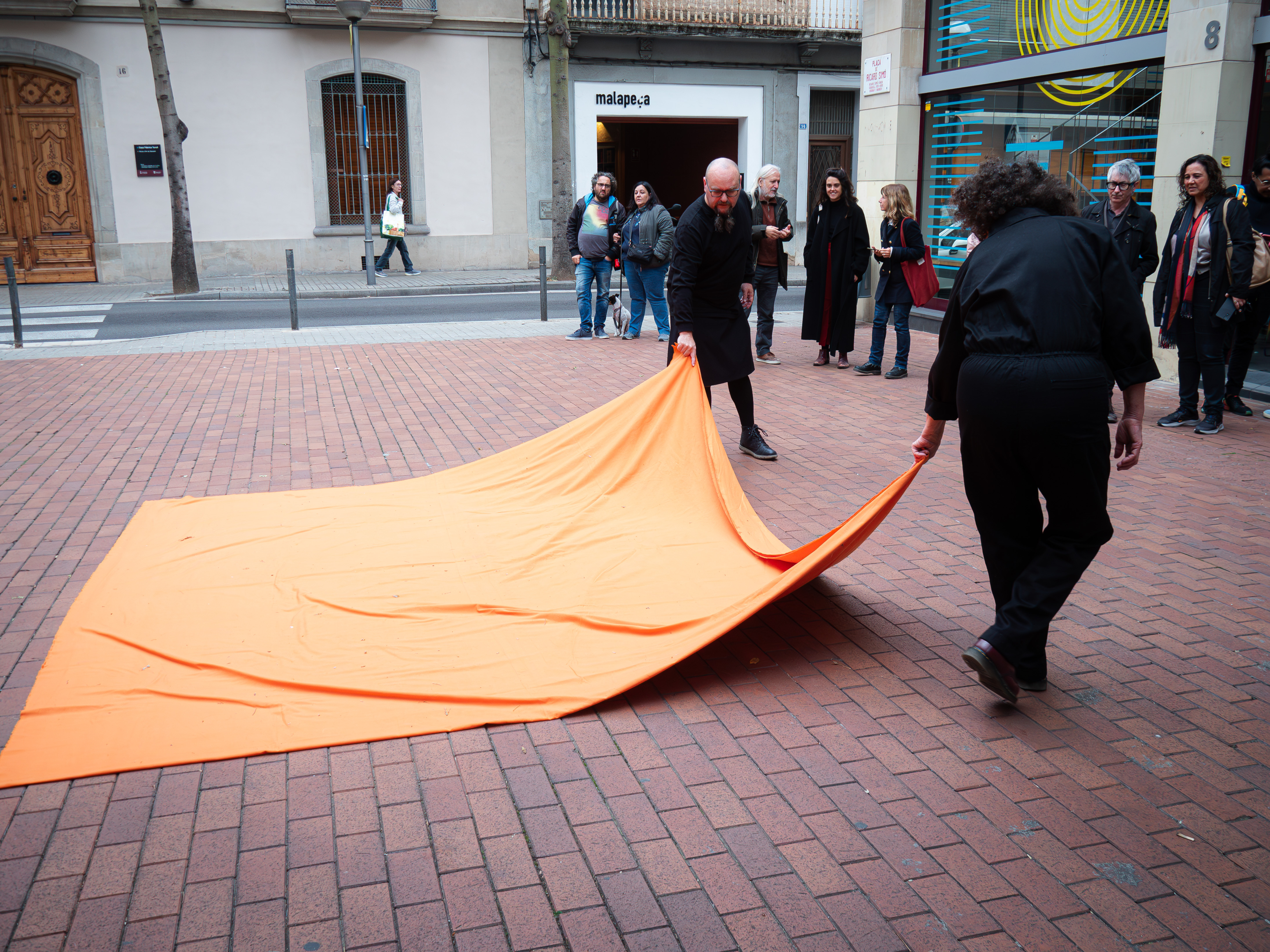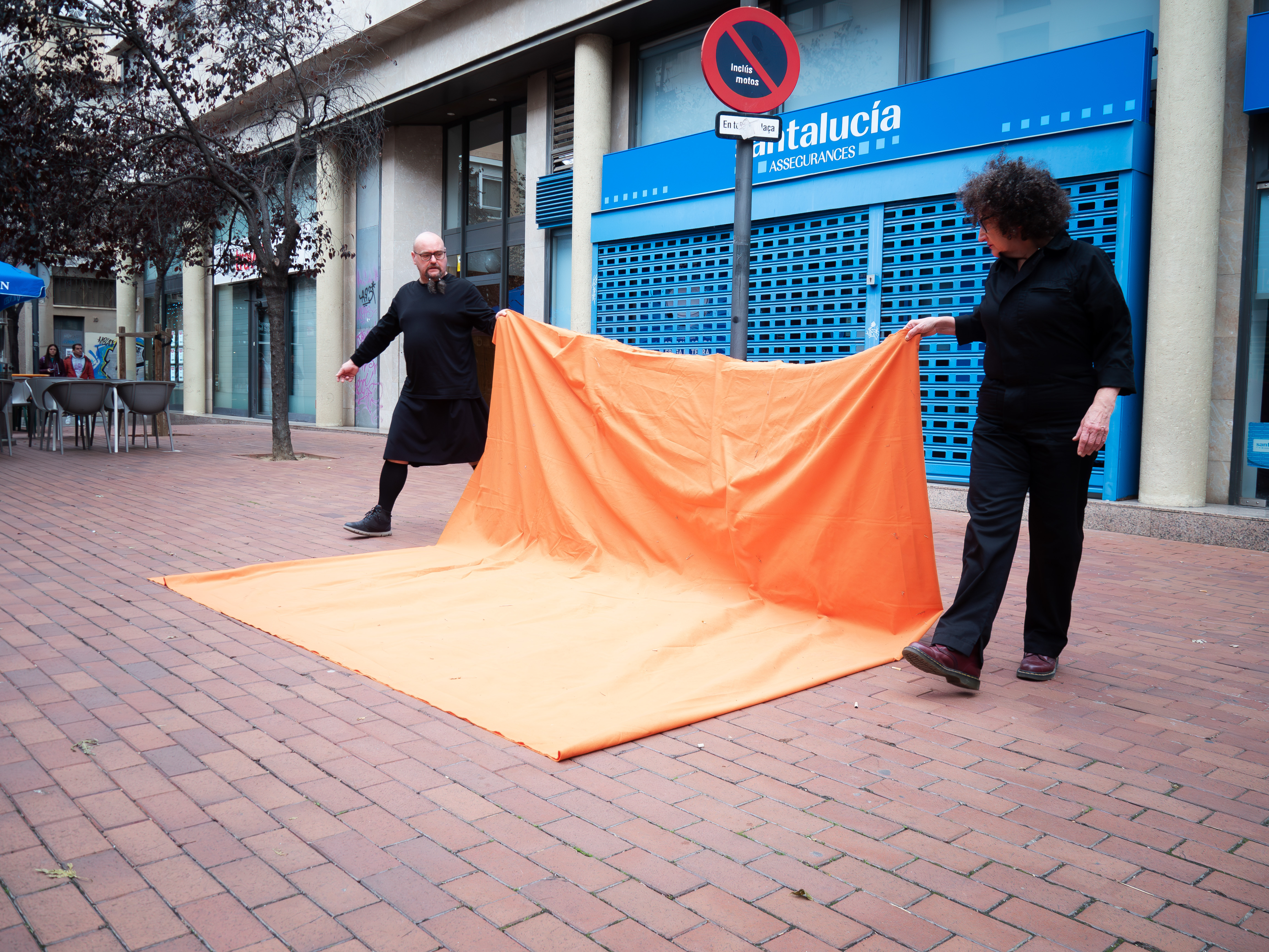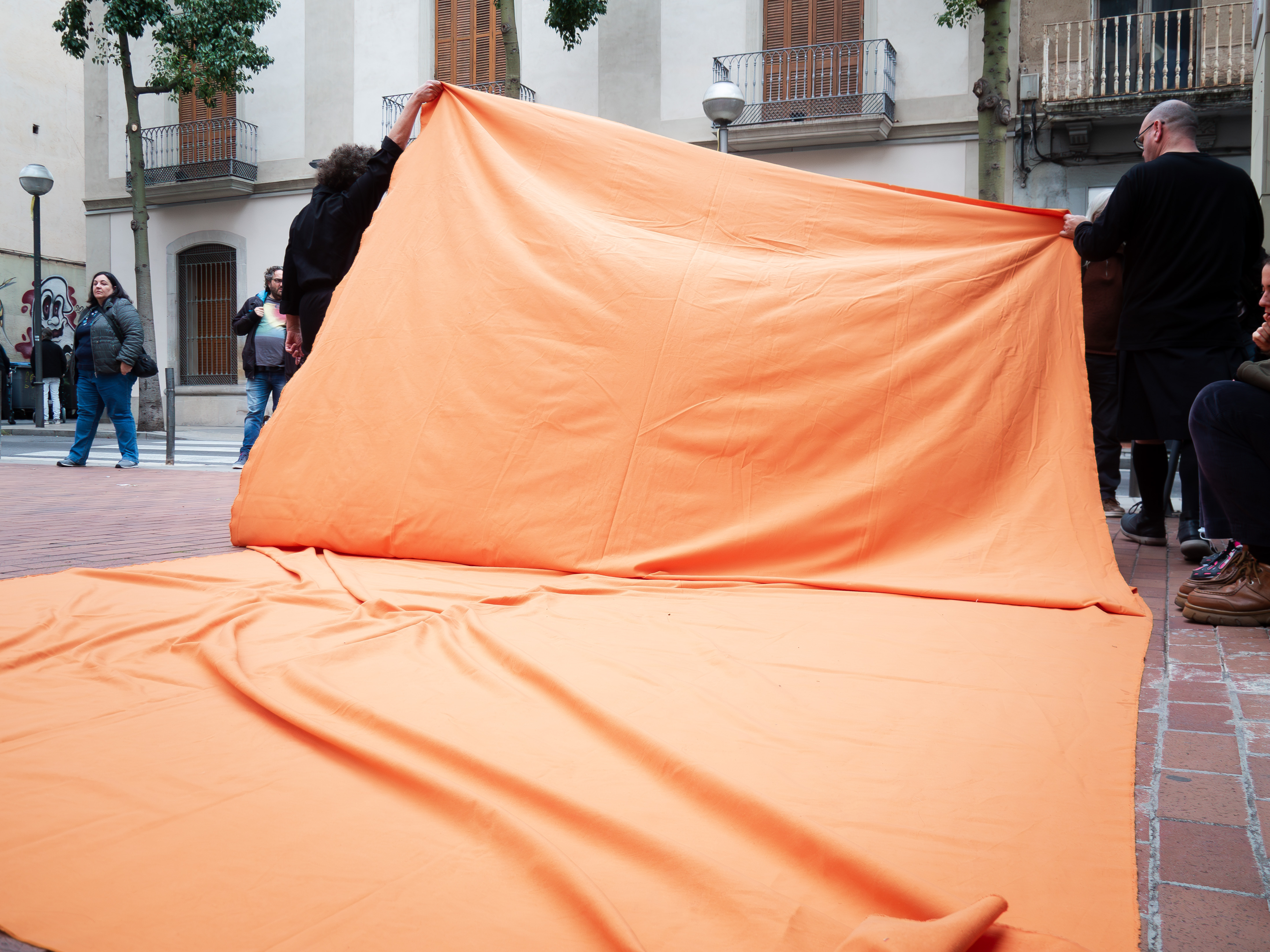 Nuestro trabajo consistió en desplegar, plegar y girar una tela de 22,5 metros cuadrados de forma que fuimos haciendo un recorrido de ida y vuelta por la plaza. La performance duró aproximadamente cuarenta y cinco minutos