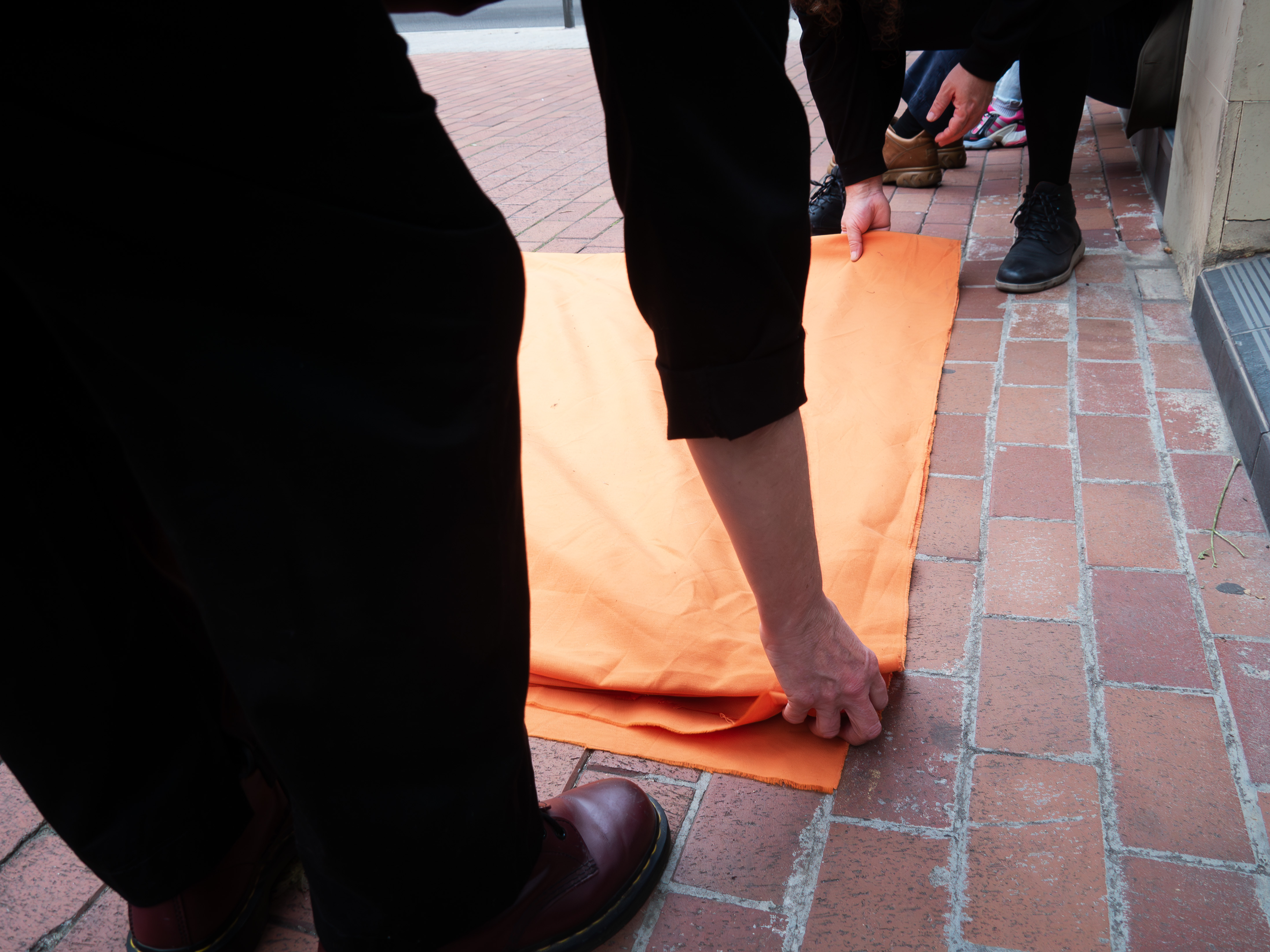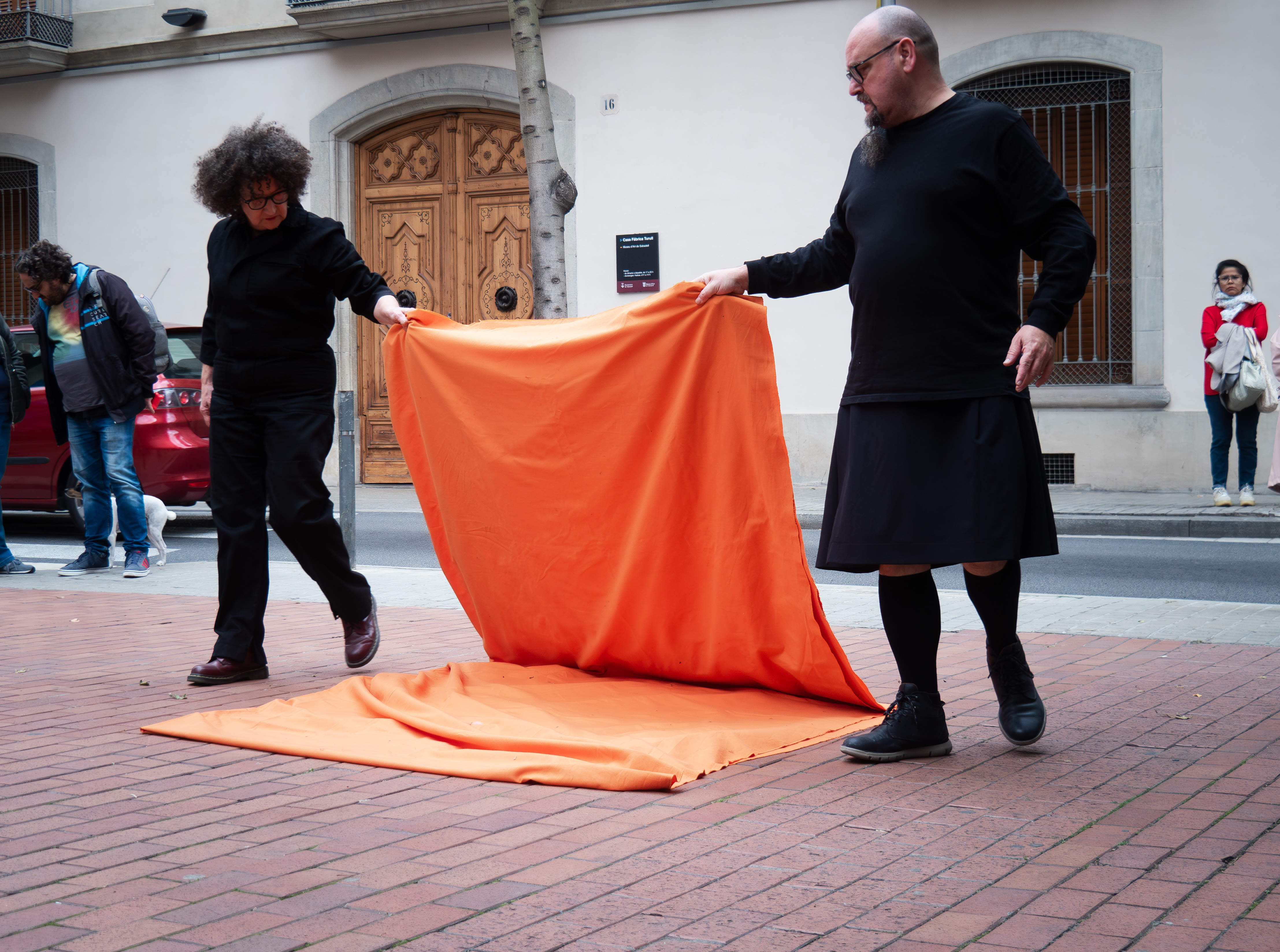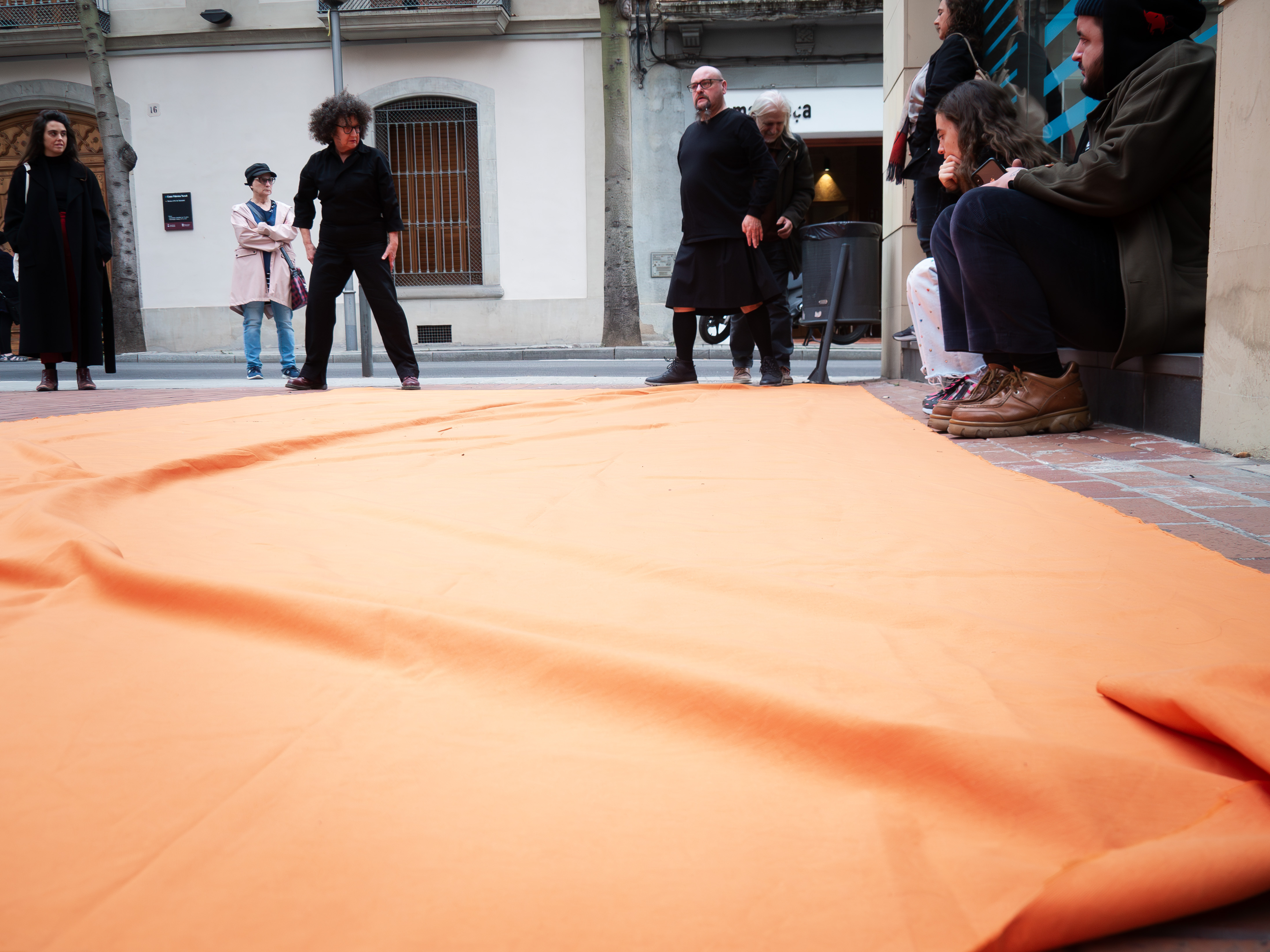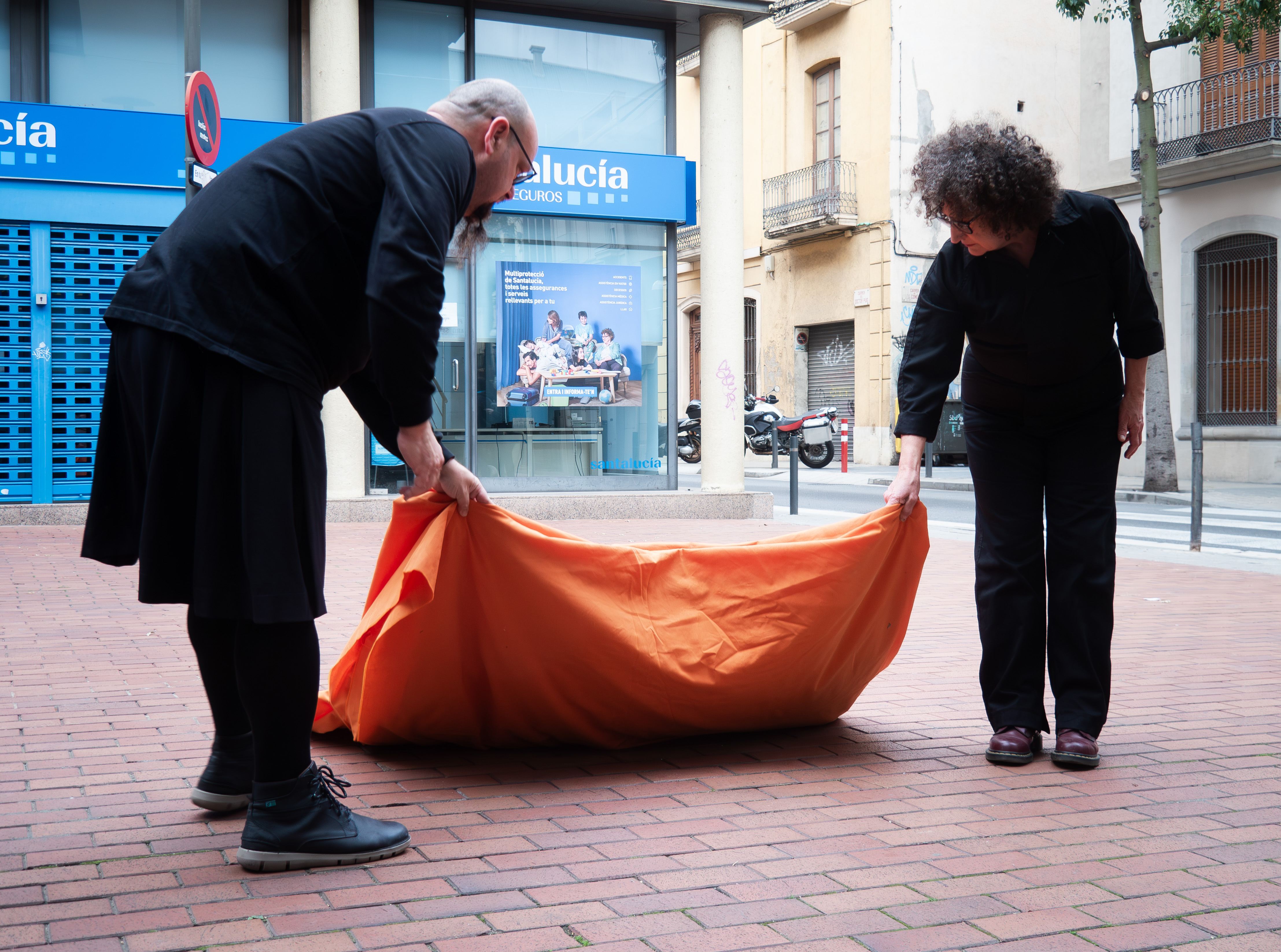 Nuestro trabajo consistió en desplegar, plegar y girar una tela de 22,5 metros cuadrados de forma que fuimos haciendo un recorrido de ida y vuelta por la plaza. La performance duró aproximadamente cuarenta y cinco minutos