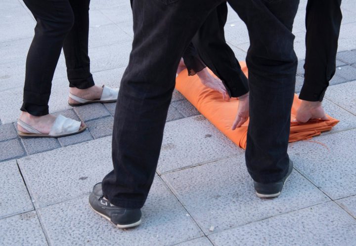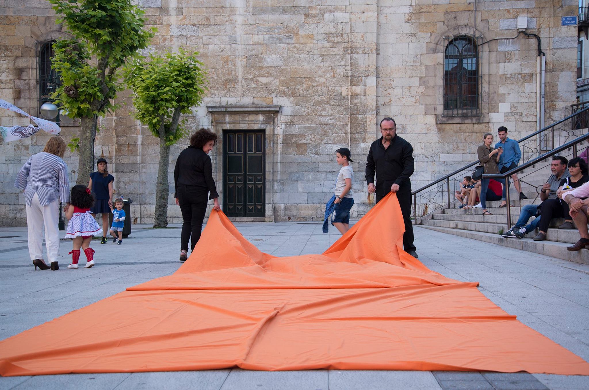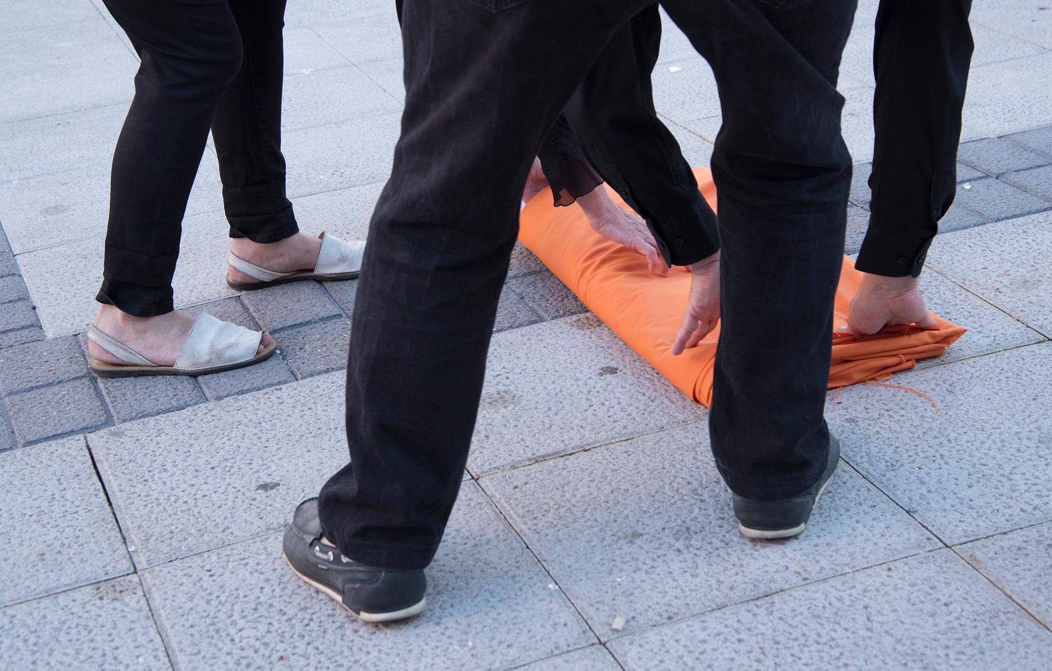 Nuestro trabajo consistió en desplegar, plegar y girar una tela de 22,5 metros cuadrados de forma que fuimos haciendo un recorrido de ida y vuelta por la plaza. La performance duró aproximadamente una hora y media.