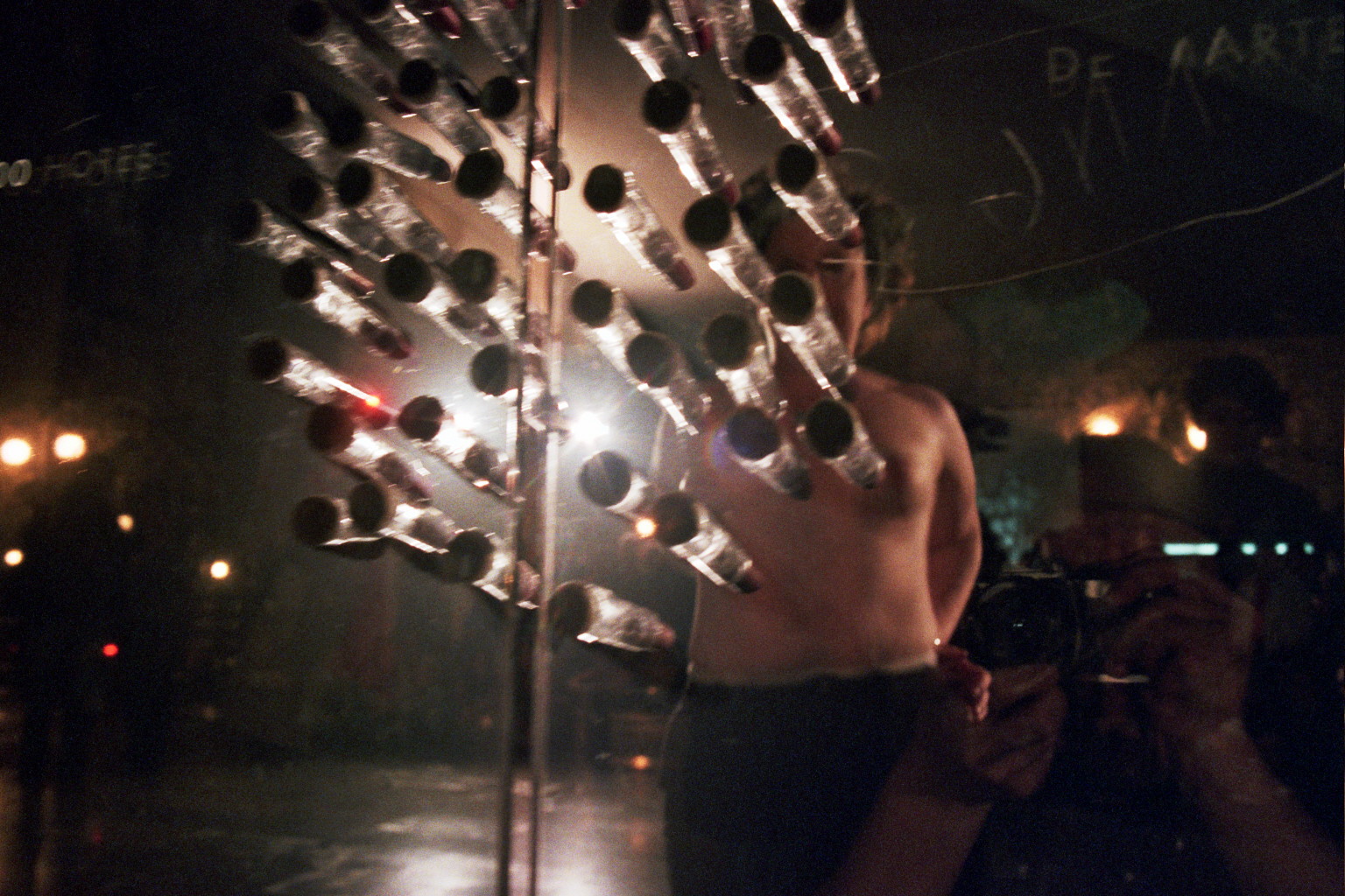 Una vez fijadas todas en la pared, me separo unos diez metros, me quito la camisa, me sujeto las manos a la espalda con unas esposas y me lanzo contra las barras de labios que dejarán en mi pecho una enorme mancha roja.