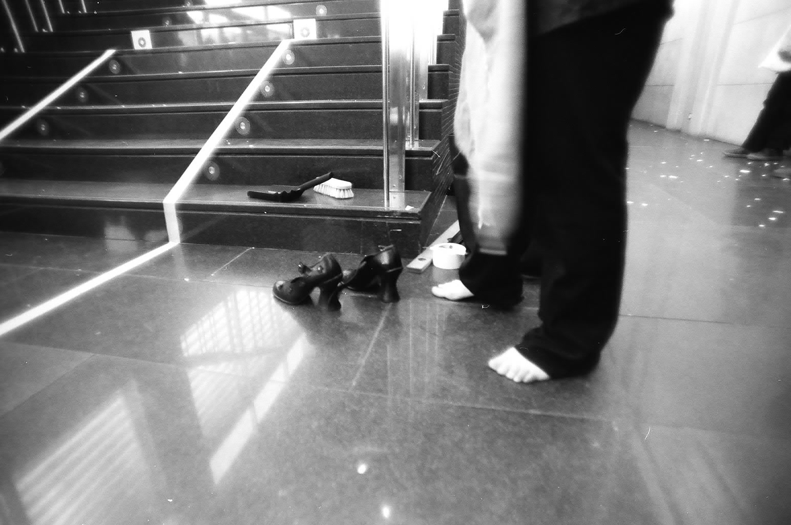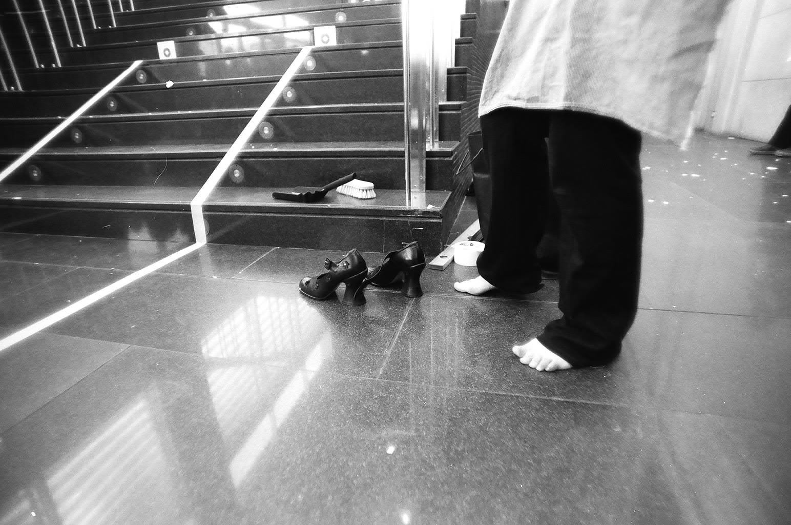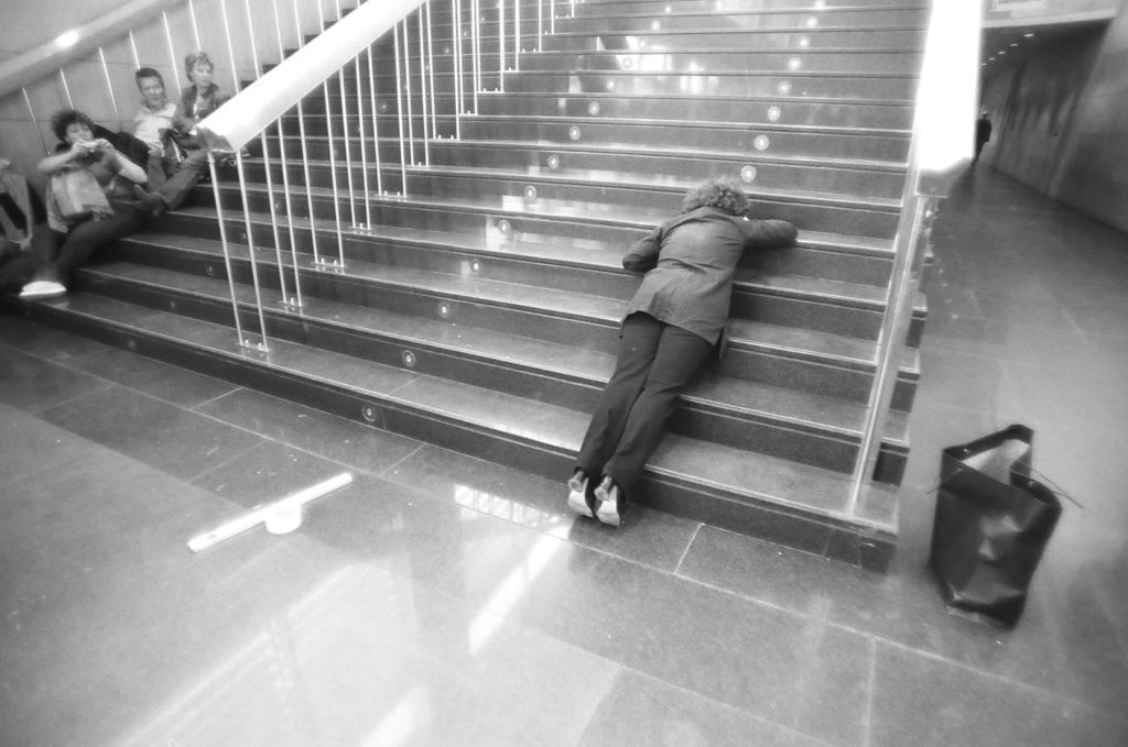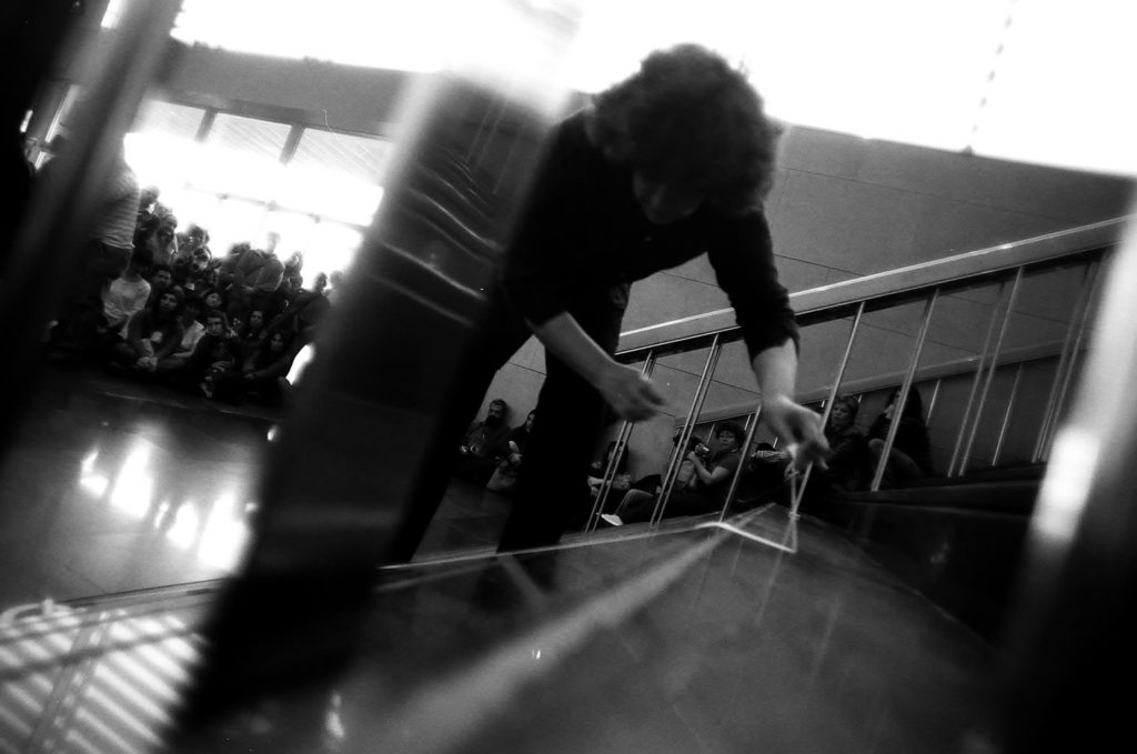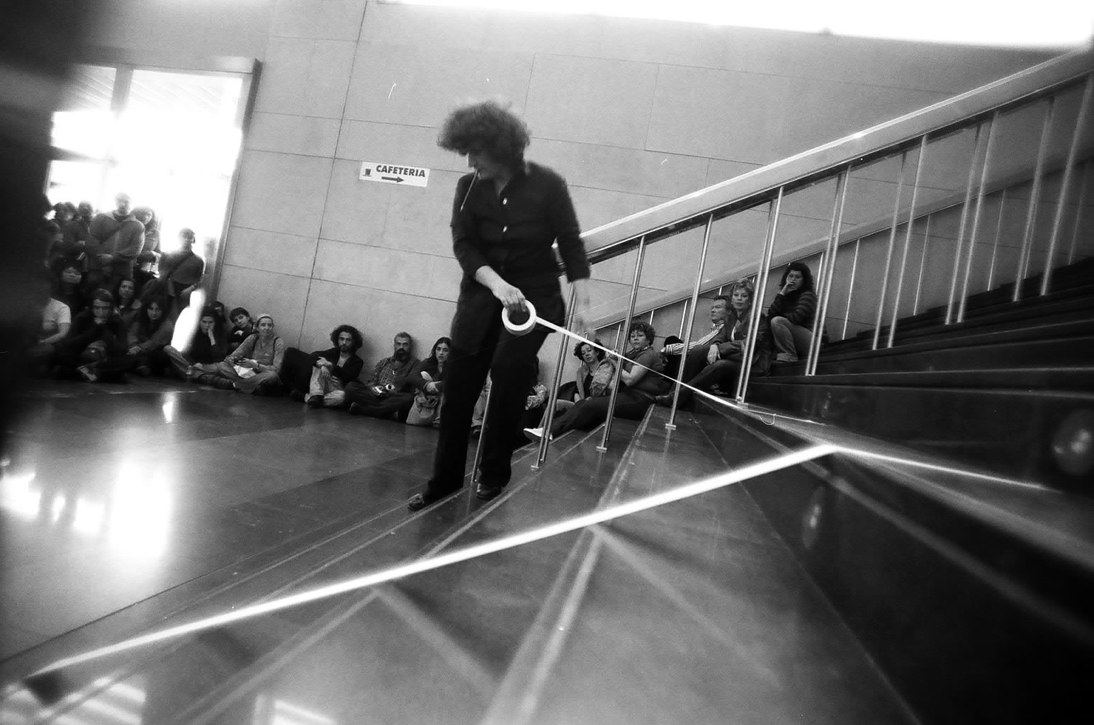 Construir mediante dianas y cinta negra, usando mi cuerpo como medida, una sala de práctica de tiro con seis blancos en un espacio interior cualquiera sin preparar. Puede ser el hall de un museo, unas escaleras, etc…