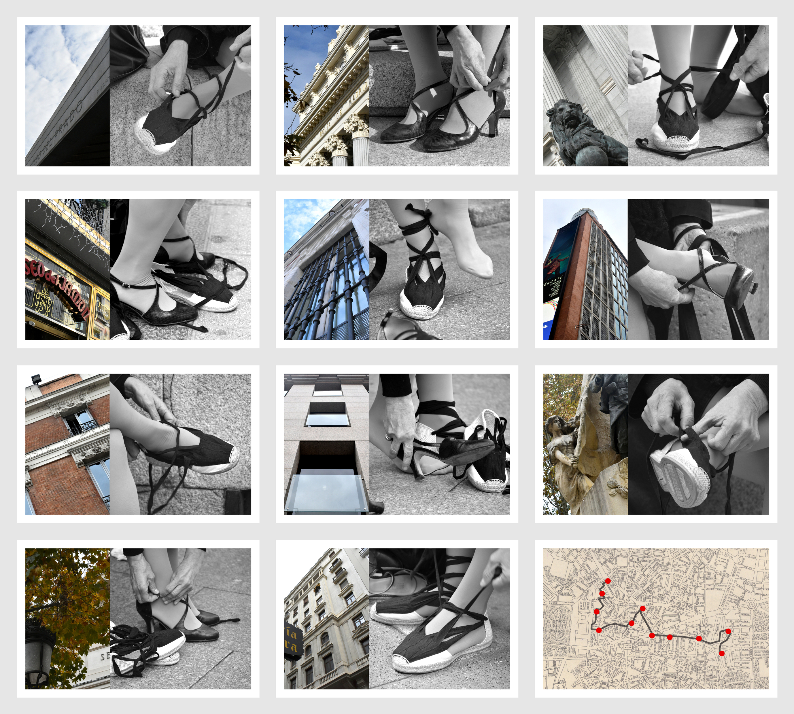 La pieza está compuesta por doce fotomontajes, once de los cuales muestran una fotografía de cada uno de los once lugares que constituían el recorrido y una fotografía de la performance en ese lugar concreto. El último fotomontaje es un plano de 1945, que muestra la antigua nomenclatura de calles y plazas, intervenido con el recorrido de la performance.