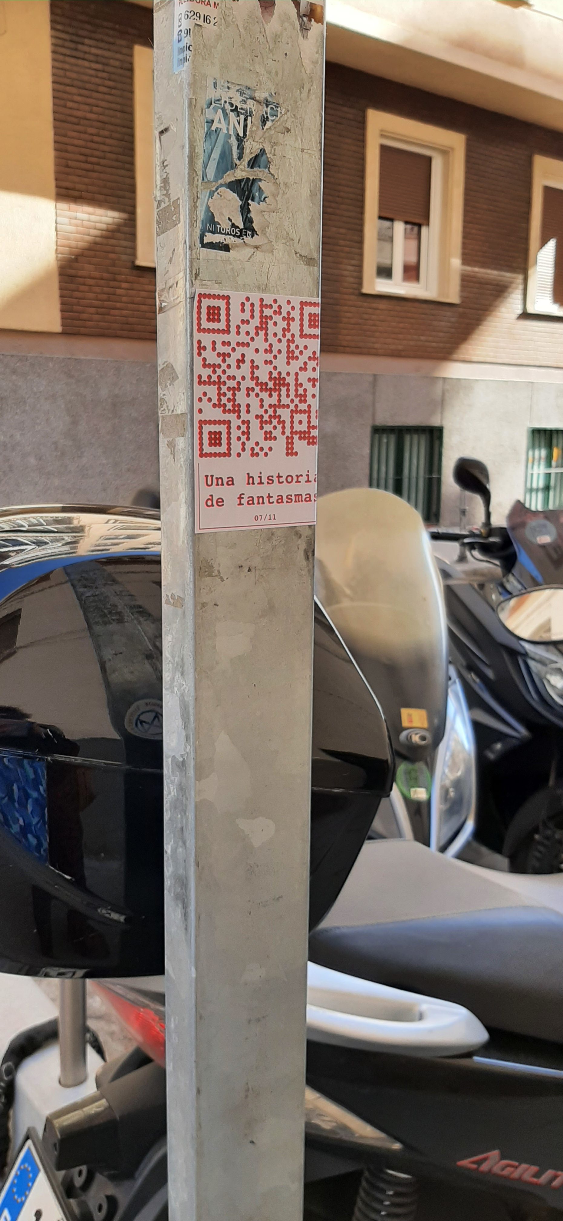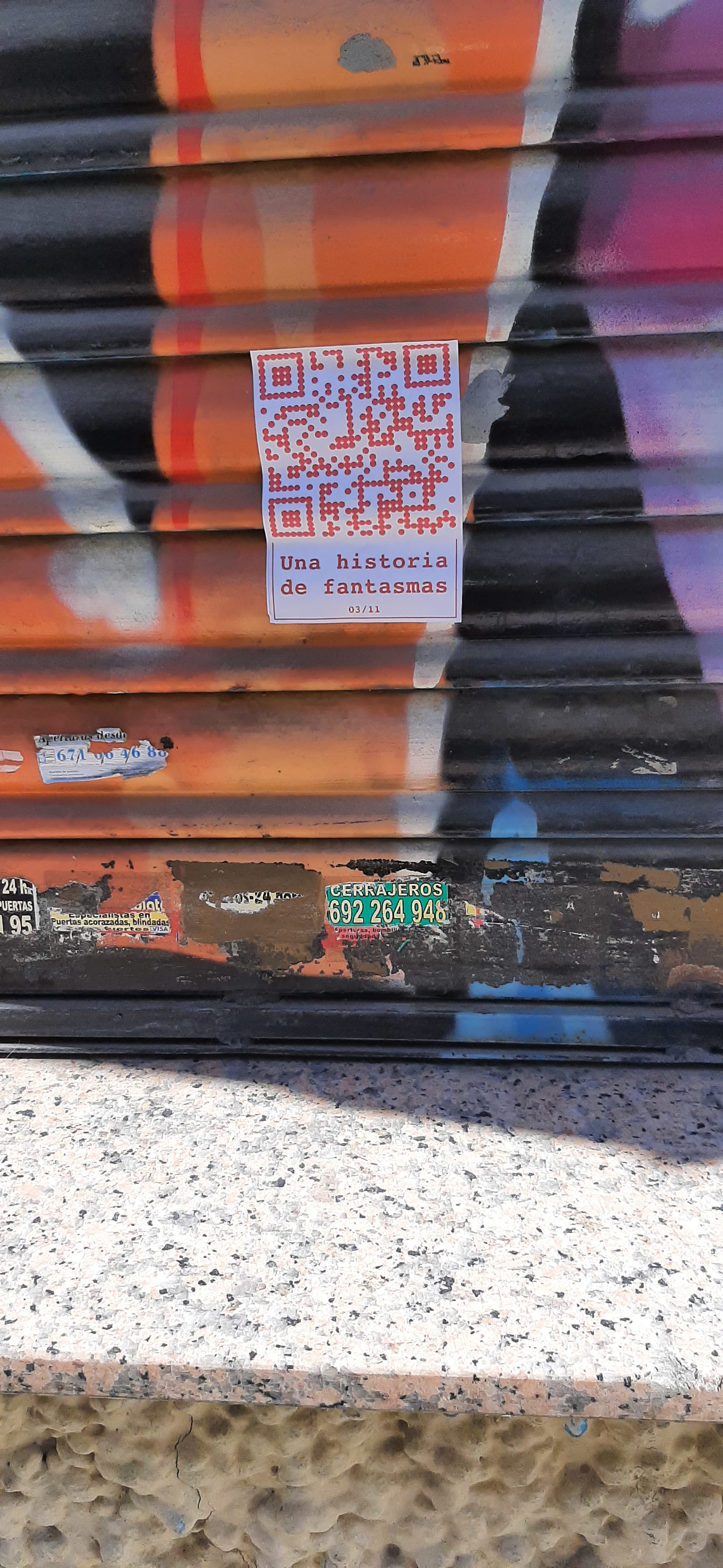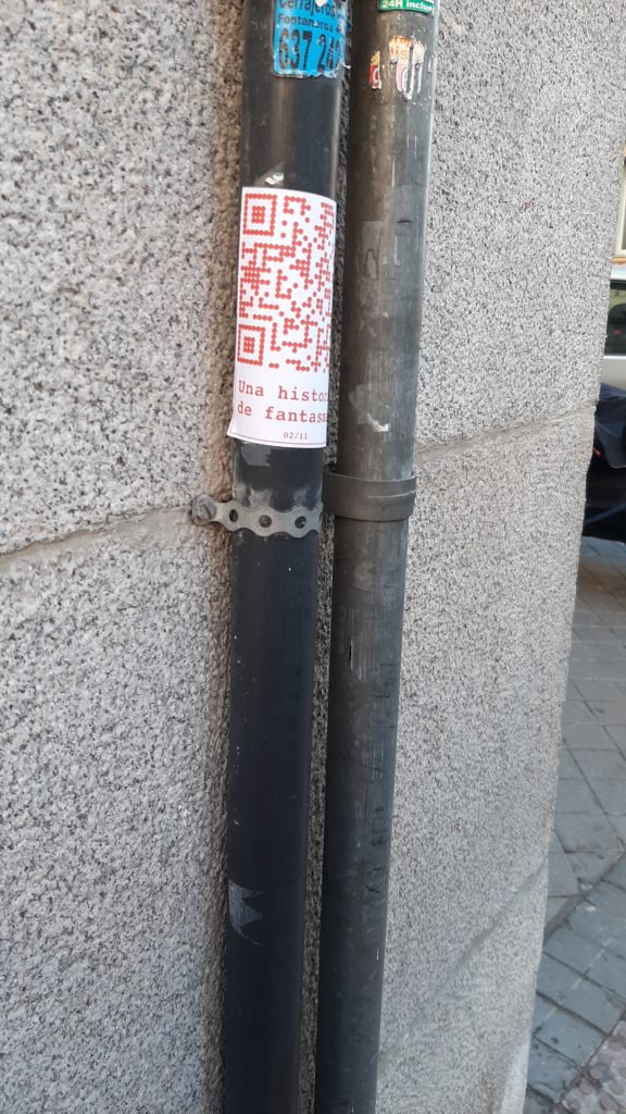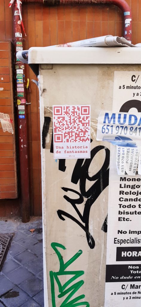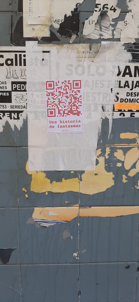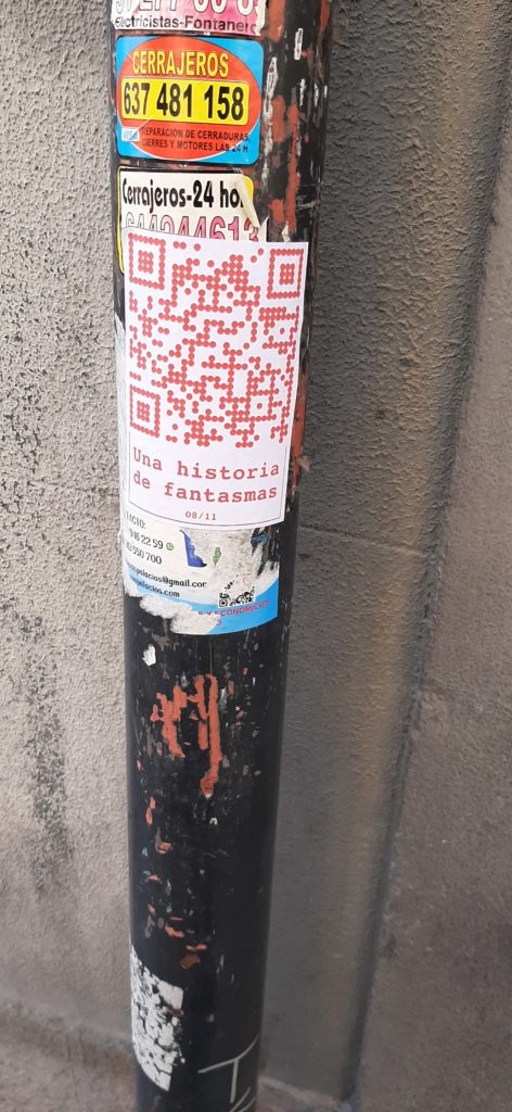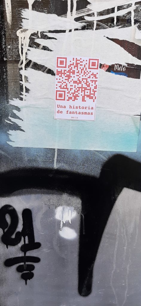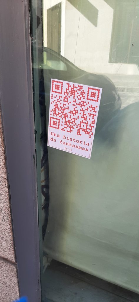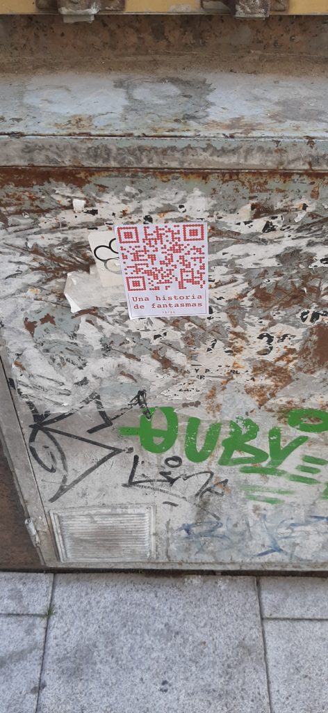 Cualquiera que se encuentre con estos códigos QR y los escanee se encuentra con UNA (de las once) HISTORIA DE FANTASMAS. Una historia que transita entre un presente virtual y el pasado en un tiempo activo pero también en un tiempo y espacio fantasmagórico que se está diluyendo de la memoria.